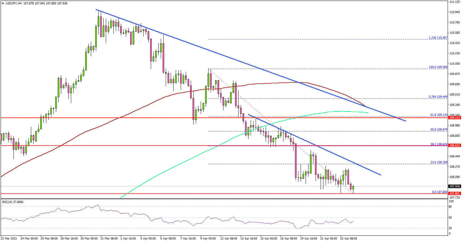 - USD/JPY extended its decline below 108.50 and 108.00.
