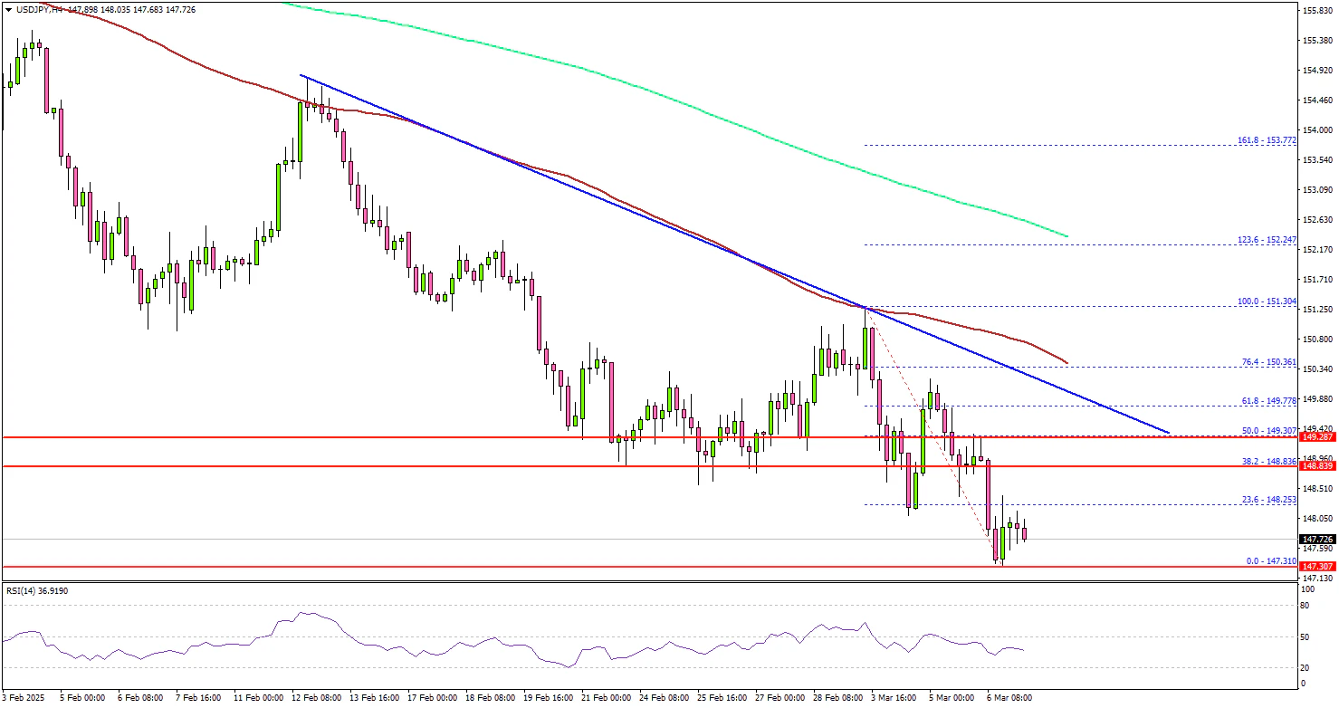 It tested the 147.30 zone. On the downside, immediate support sits near the 147.20 level. The next key support sits near the 146.50 level. Any more losses could send the pair toward the 145.00 level.
