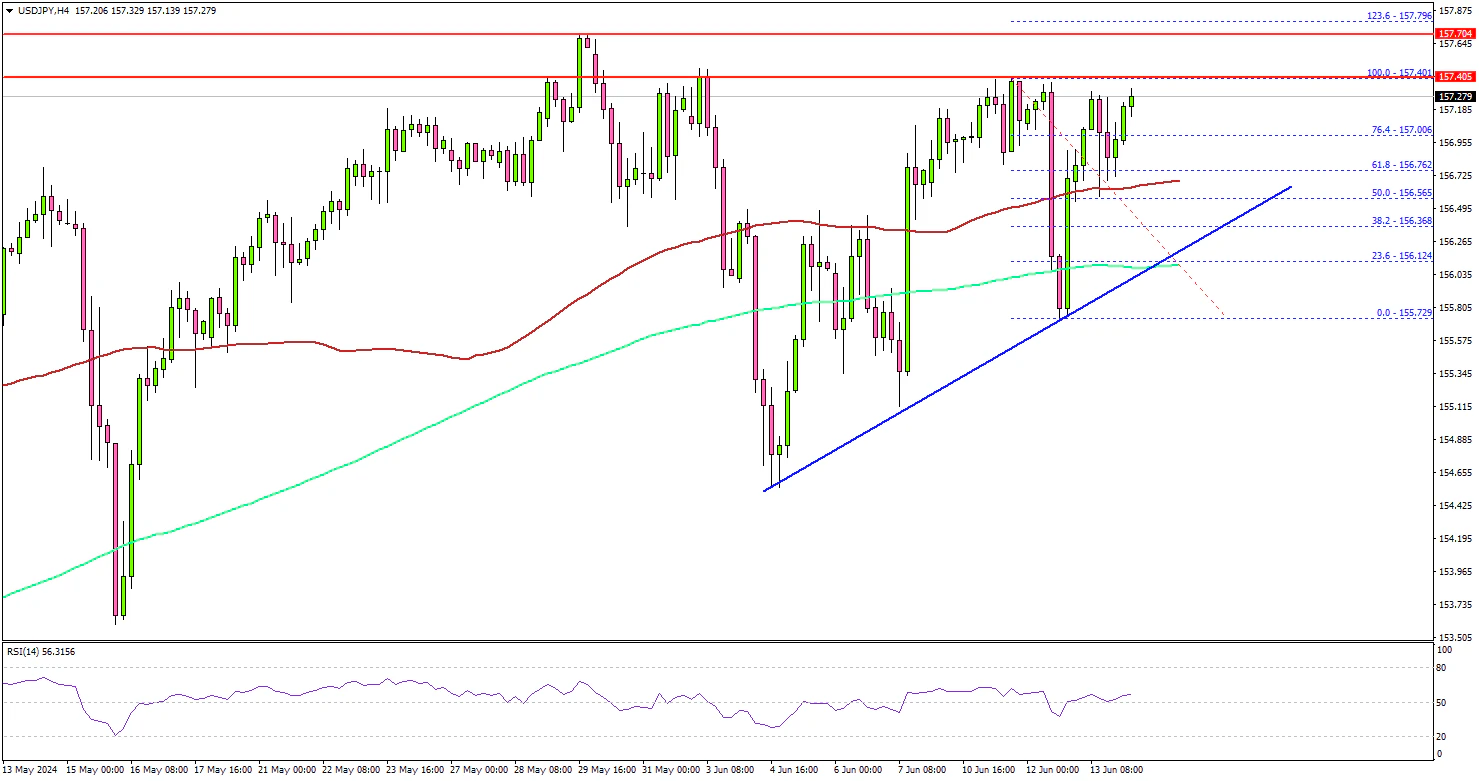 A clear move above the 158.00 resistance might send it toward the 159.20 level. Any more gains might call for a move toward the 160.00 level in the near term.