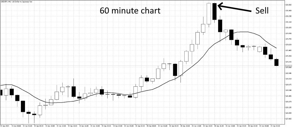 First, we check the market conditions on each of the two charts. In the 60-minute chart below, the price is significantly above the moving average and has begun to fall. That indicates an opportunity for a reversal sale. So, to measure the entry timing, we check the state of the shorter 5-minute chart, which also begins to show a reversal movement. This confirms the timing is good for a reversal sale. Alternatively, if the 5-minute chart had not yet shown this move, it would mean that it's not good timing for the entry on a reversal sale.