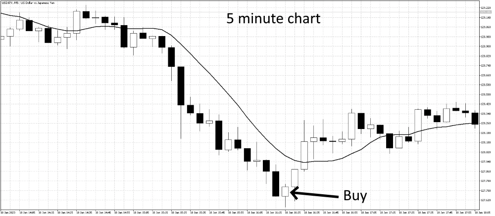 As in the first Example, check the market situation on each of the two charts. In the case of the chart below, the 60-minute chart shows that the price has diverged significantly below the moving average, indicating an oversold condition. The price has then just started to rise back to the moving average. This is an opportunity to buy entry. To time the entry, we check the 5-minute chart, which shows that the downward moving average has turned sideways and the price has crossed above the moving average. This timing is an excellent buy-entry opportunity. As in this case, the trading strategy is to wait for the shorter time chart to rise and see the longer time interval chart rise also.