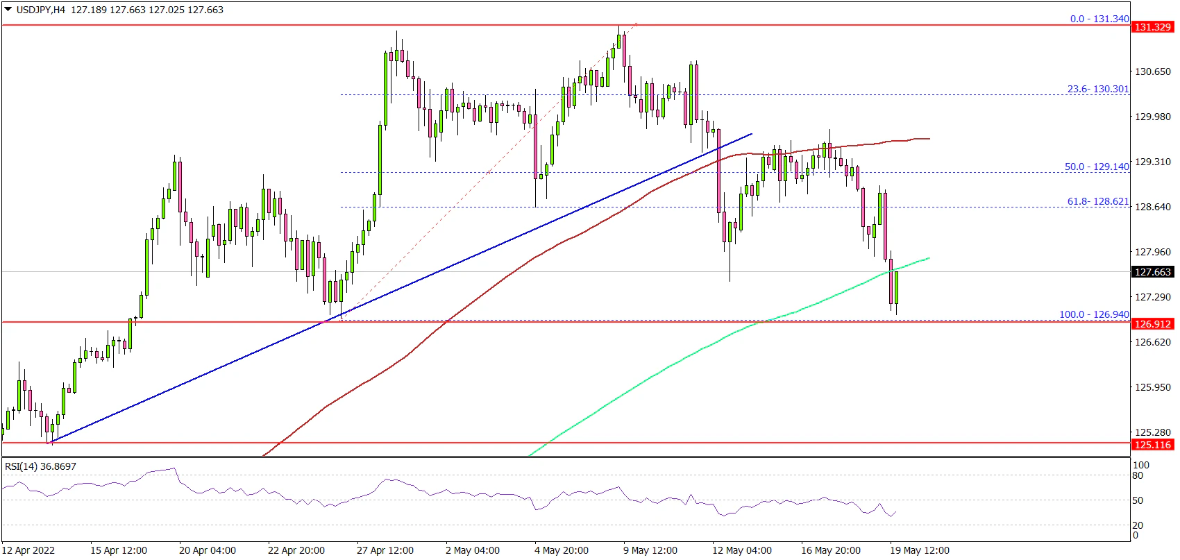 • It broke a major bullish trend line with support near 129.40 on the 4-hours chart.