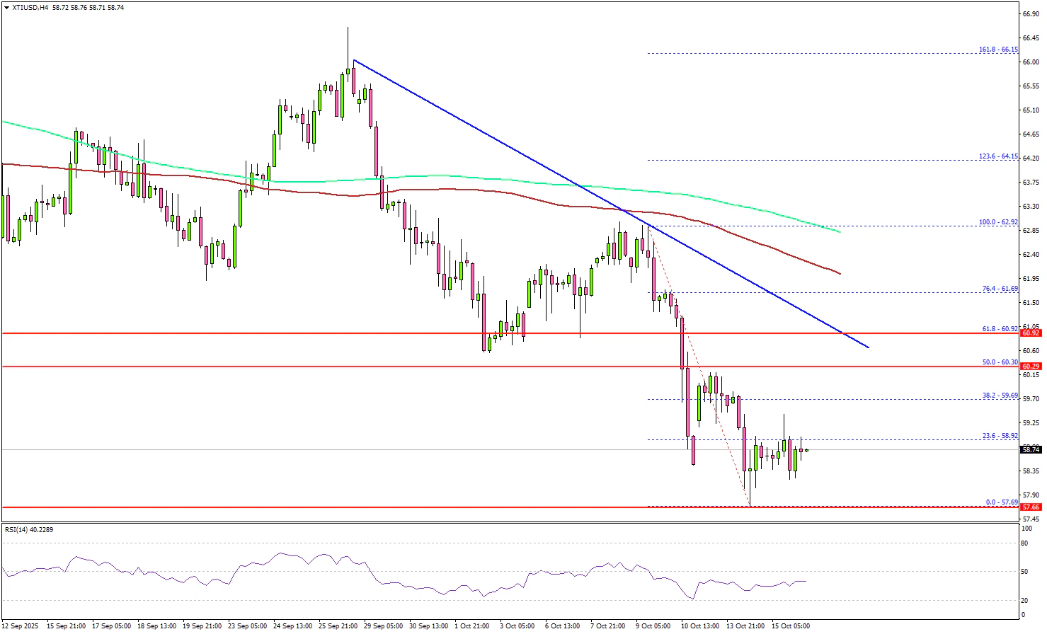 Looking at the 4-hour chart of XTI/USD, the price settled below $60.00, the 100 simple moving average (red, 4-hour), and the 200 simple moving average (green, 4-hour). Finally, the bulls appeared near the $57.70 level.