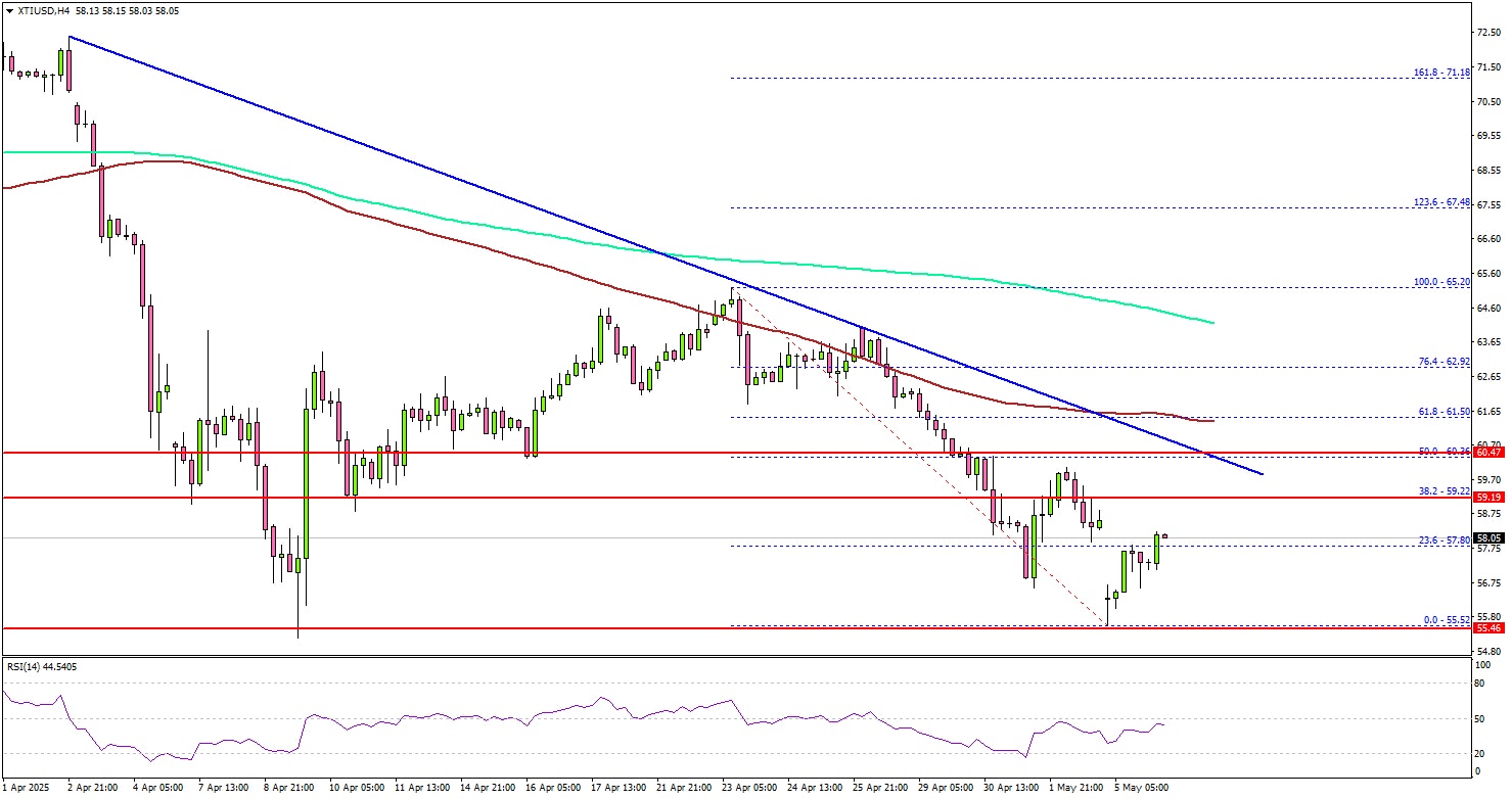 On the upside, the price is facing hurdles near the $59.20 level. The first key resistance sits near the $60.00 level. There is also a connecting bearish trend line forming with resistance at $60.20 on the same chart.