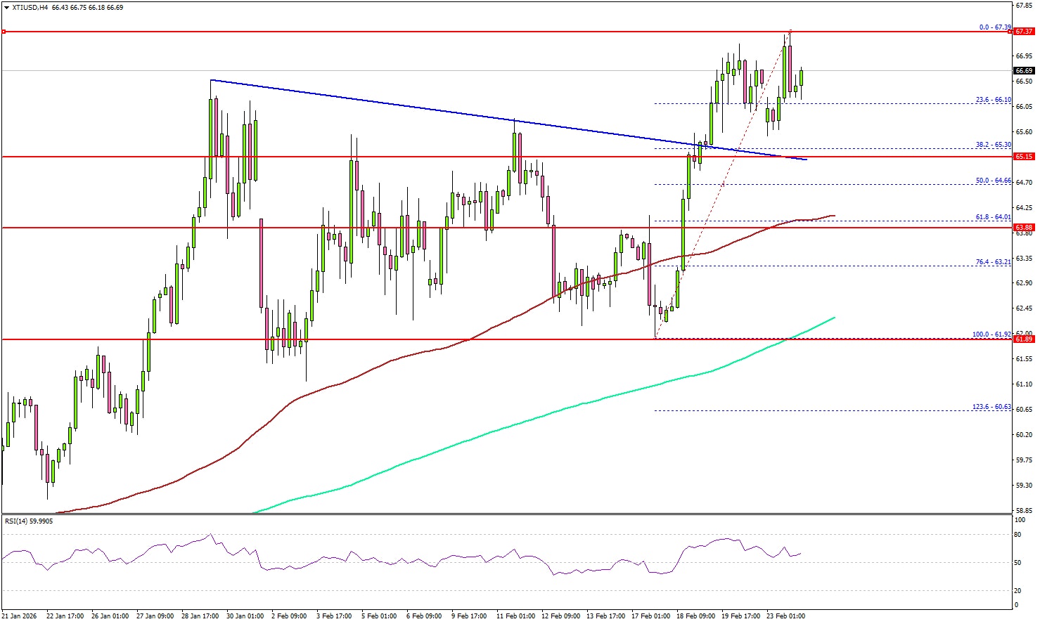 On the downside, the first major support sits near the $65.50 zone. The next support could be $65.00, below which the price could dive and test the 100 simple moving average (red, 4-hour) at $63.95.