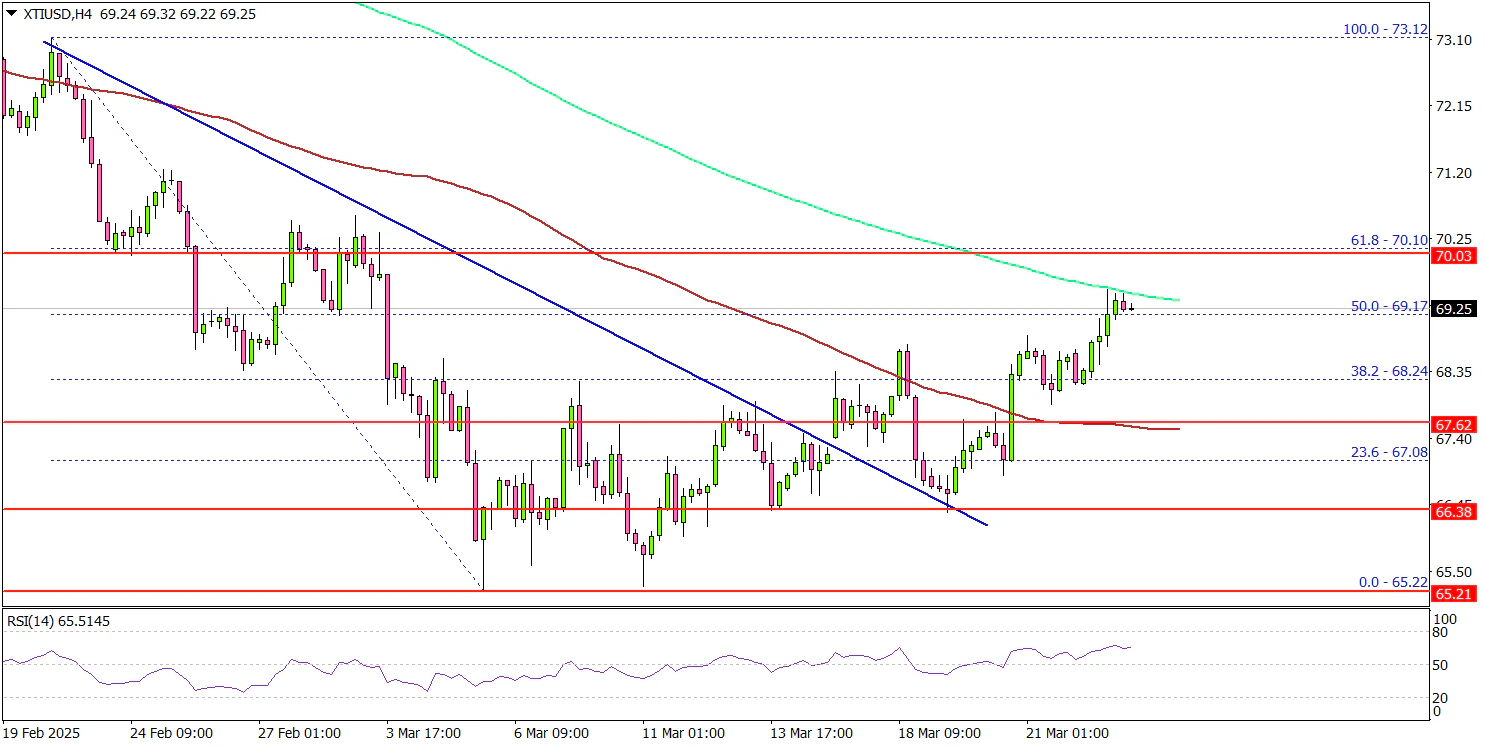 WTI Crude Oil price extended losses below $70.00. The price tested the $65.20 zone and recently started a recovery wave.