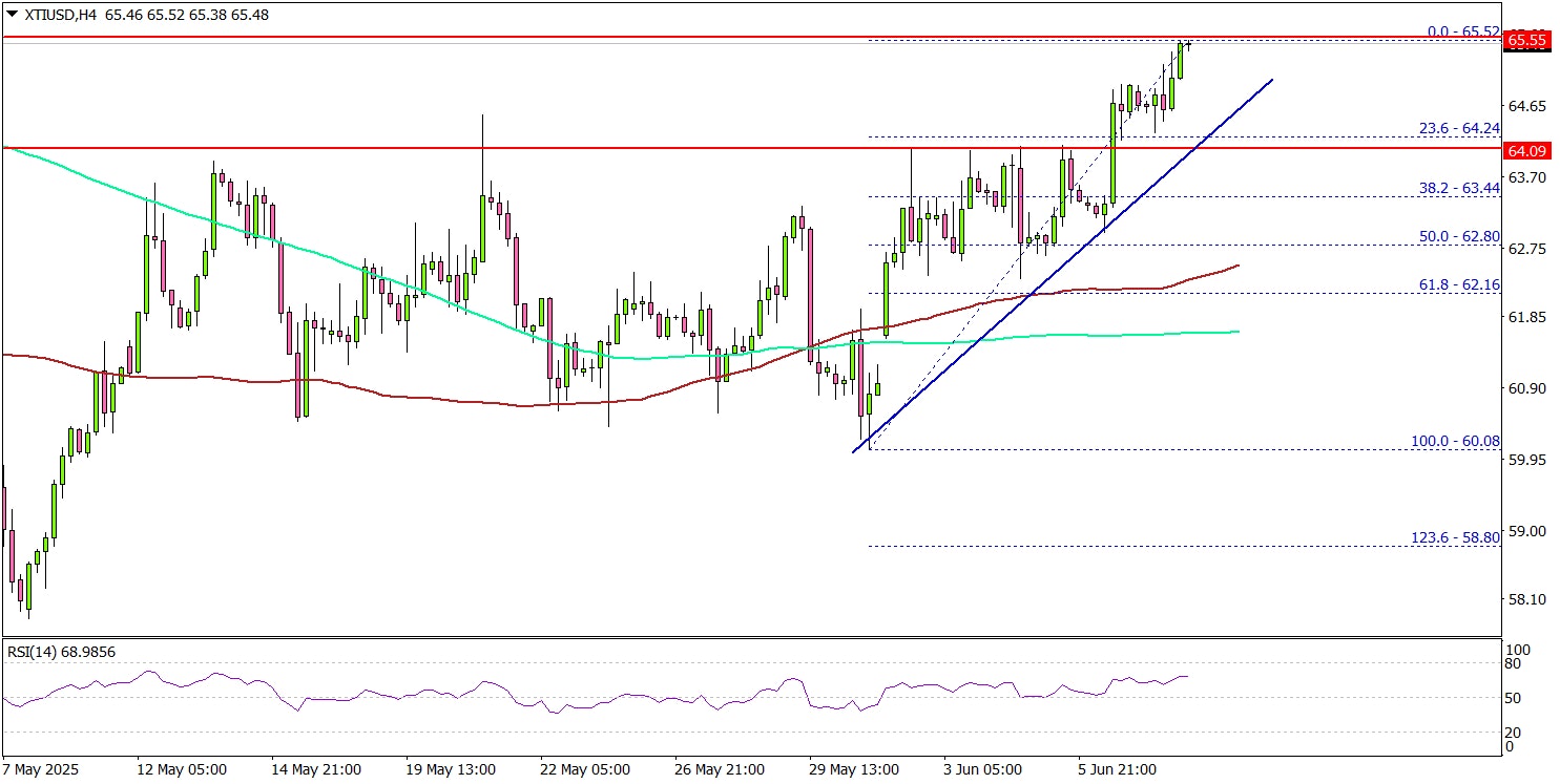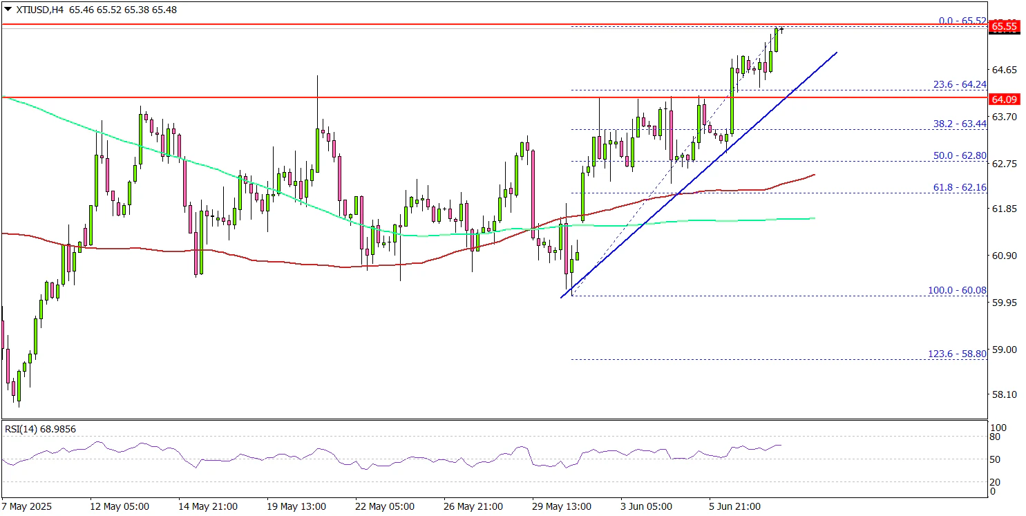The bulls even pushed the price above $65.00 before the bears appeared. The current price action suggests that the price might rise further above the $65.50 resistance. The first key resistance sits near the $66.20 level.