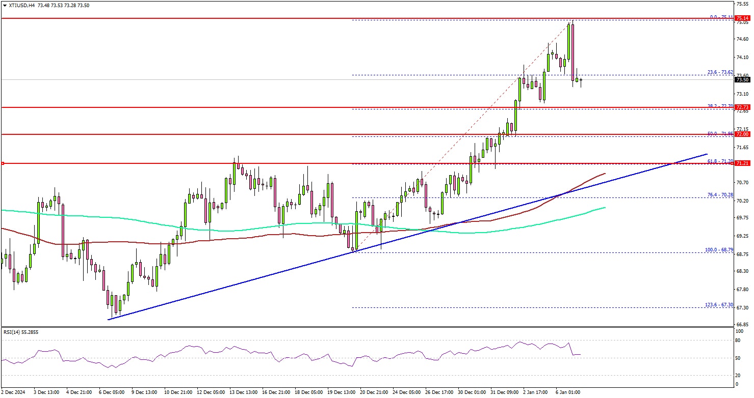 On the upside, the price is facing hurdles near the $74.20 level. The main hurdle is still near the $75.00 zone, above which the price may perhaps accelerate higher.