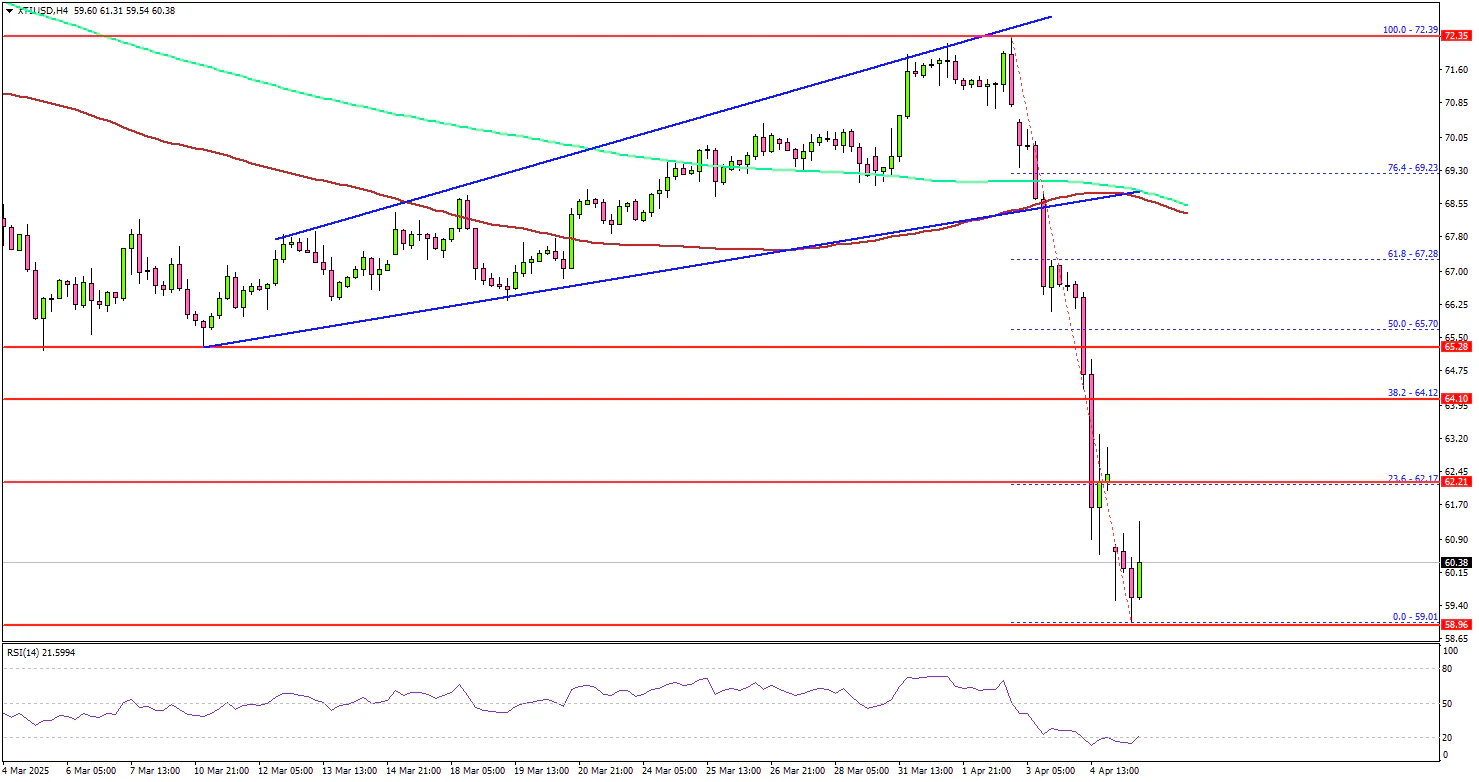 WTI Crude Oil price started a major decline from $72.50 against the US Dollar. It declined heavily below the $68.00 and $65.00 support levels.