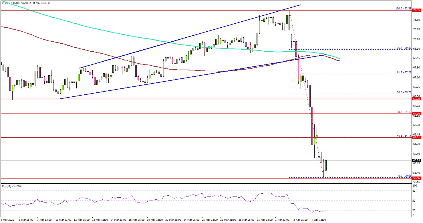 It is also well below the 100 simple moving average (red, 4-hour) and the 200 simple moving average (green, 4-hour). On the upside, the price is facing hurdles near the $61.80 level. The first key resistance sits near the $62.20 level.