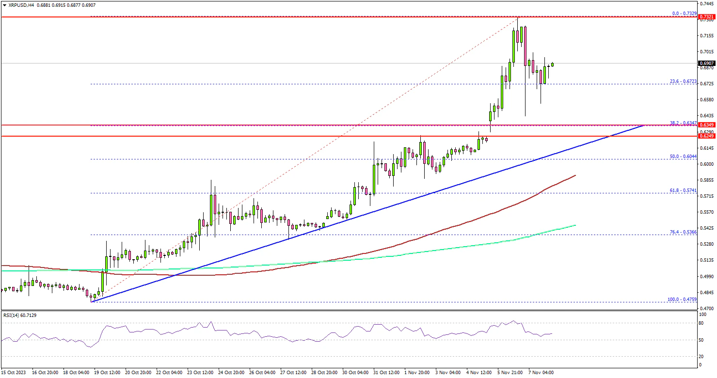 Looking at the 4-hour chart, the price surged over 15% in three days and climbed above the $0.700 level. A new multi-week high is formed near $0.7329 on TitanFX and the price is now correcting gains. There was a move below the $0.6850 level.