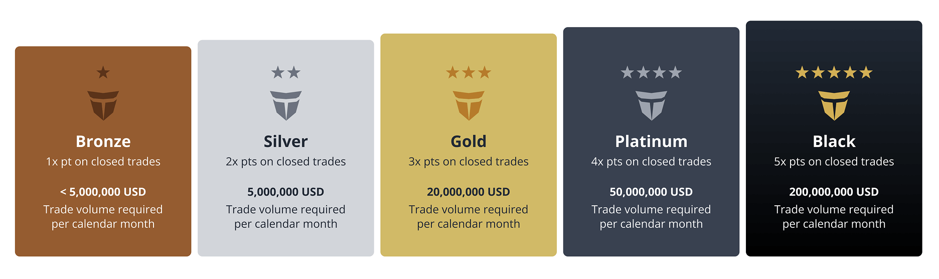 Your 12-month trading volume determines your loyalty status. The higher your tier, the more points you earn with every trade.