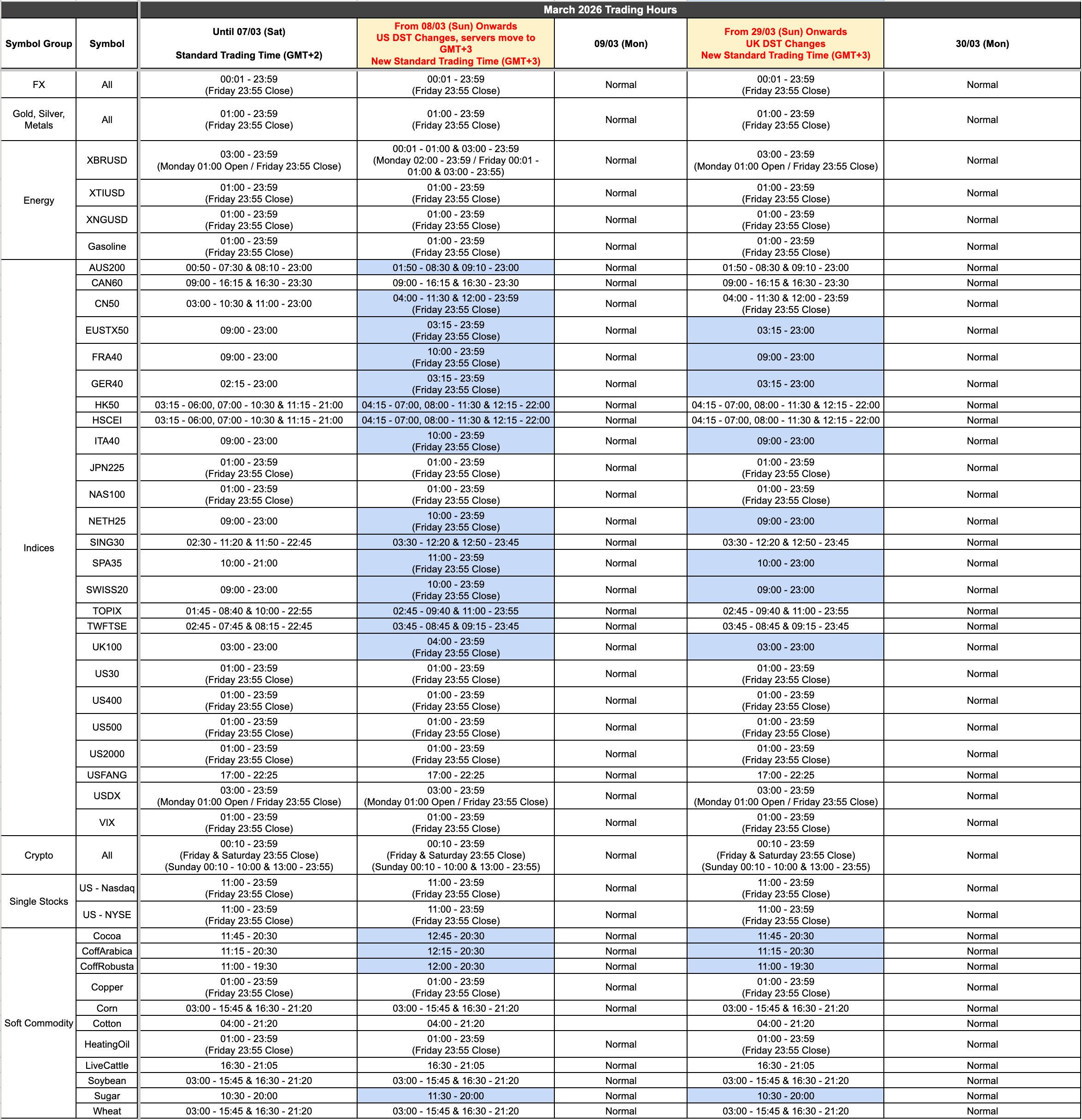 Due to US DST and UK DST change, the trading hours for some products will change as a result.