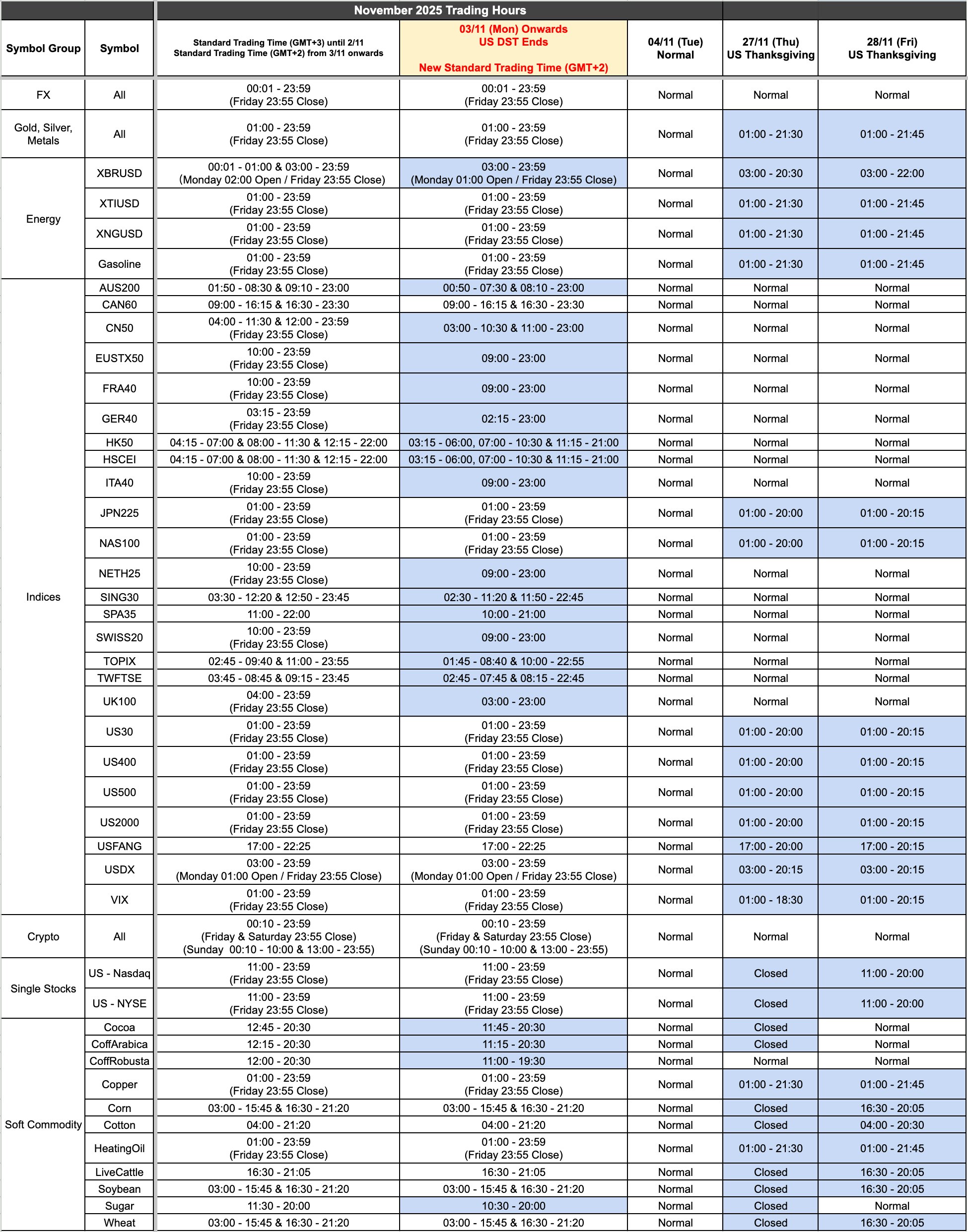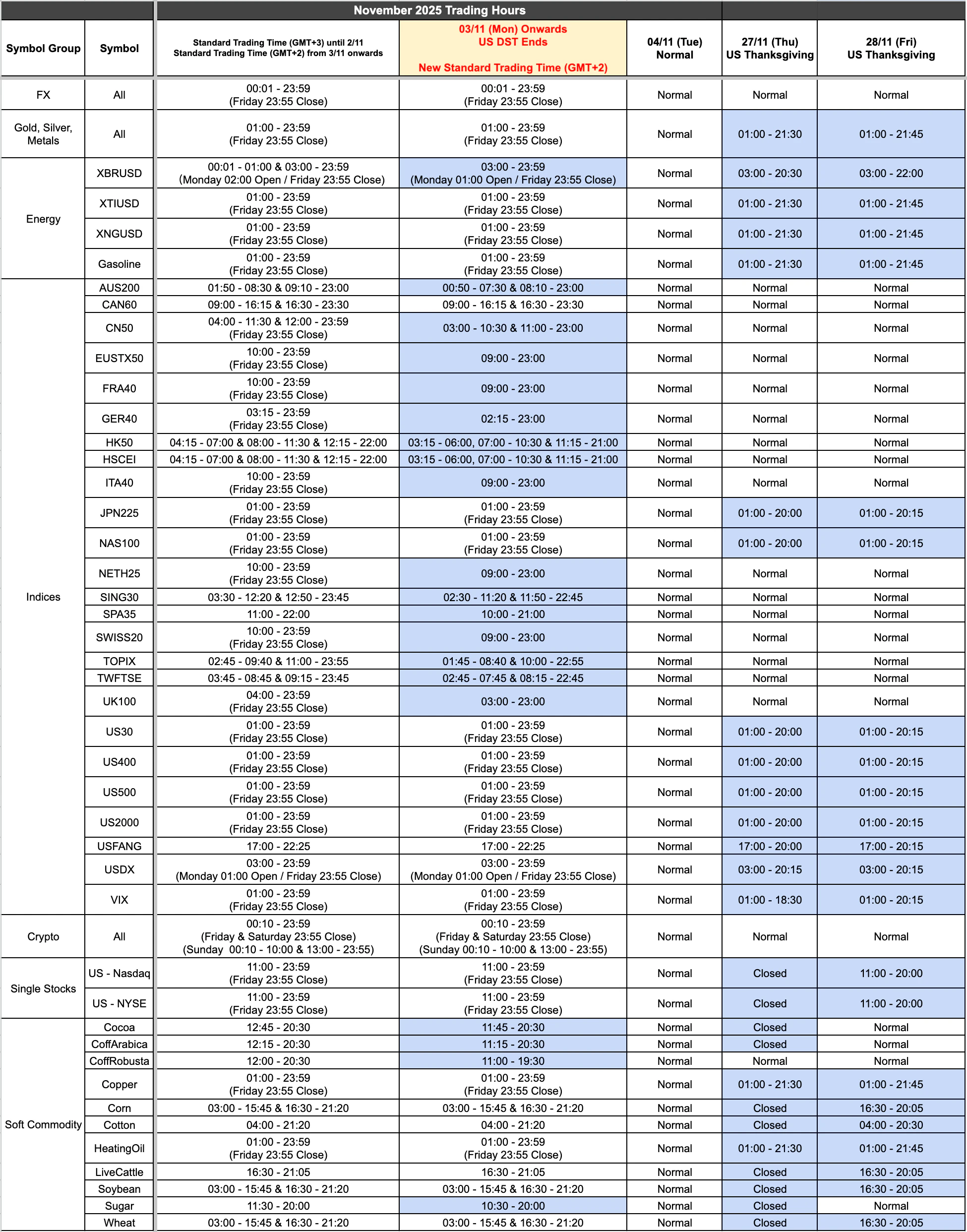 Due to public holidays in November, the trading hours for some products will change as a result. Additionally, US DST changes will result in all MT4/5 servers moving from GMT+3 to GMT+2 timezones.