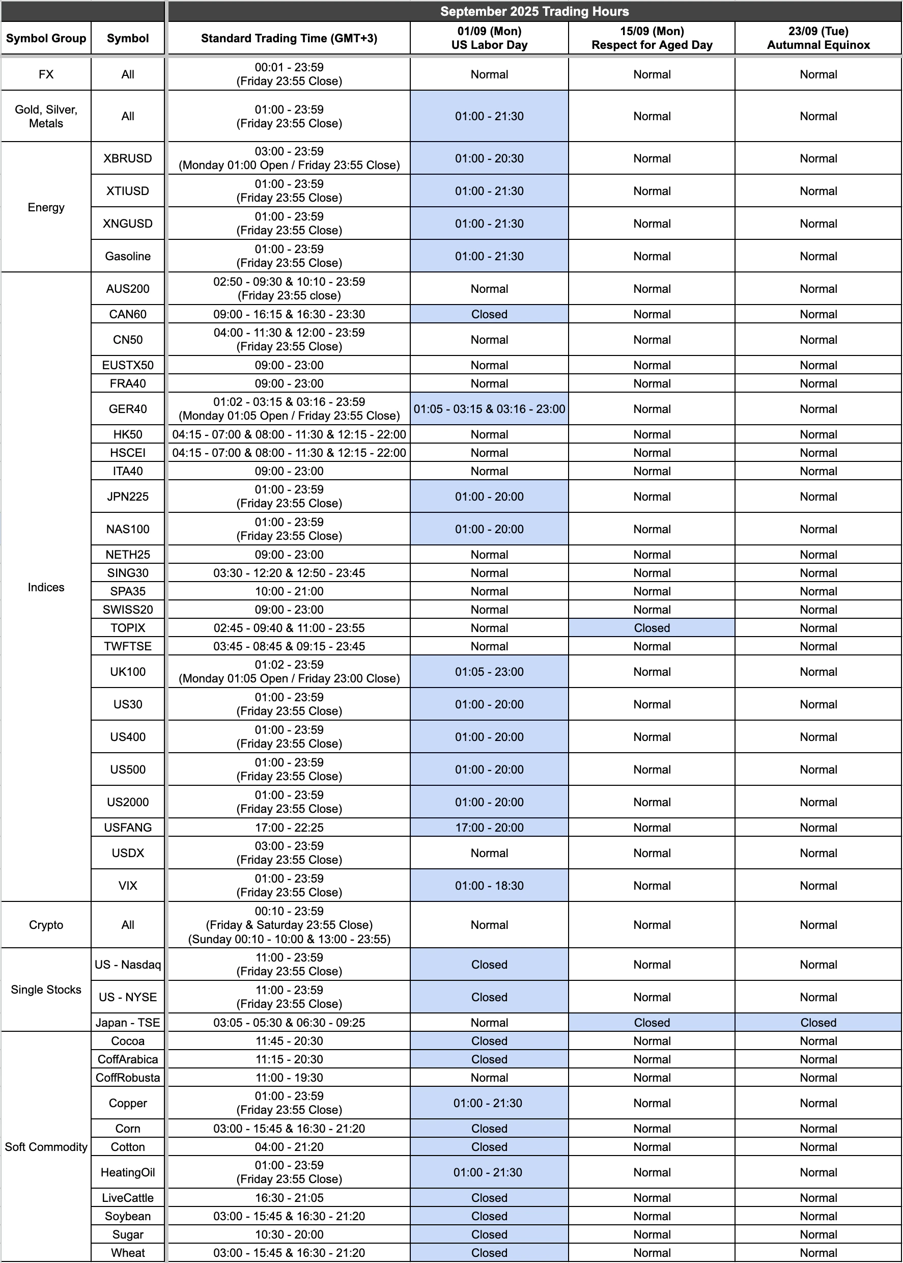 Due to public holidays in September, the trading hours for some products will change as a result.