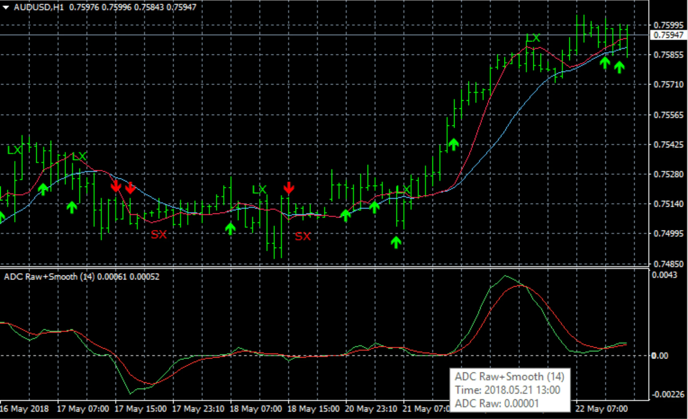 For fast signals, look for upward sloping lines and ADC raw above ADC smooth as your buying signal. For slow signals, look for both ADC raw and smooth to be above 0. Like the MACD, the raw signal line plots the difference between slow and fast indicators (divided by slow) and this is smoothed with exponential averaging, but in this case we find the smoothing length automatically, typically around 4 unlike MACD's 9.