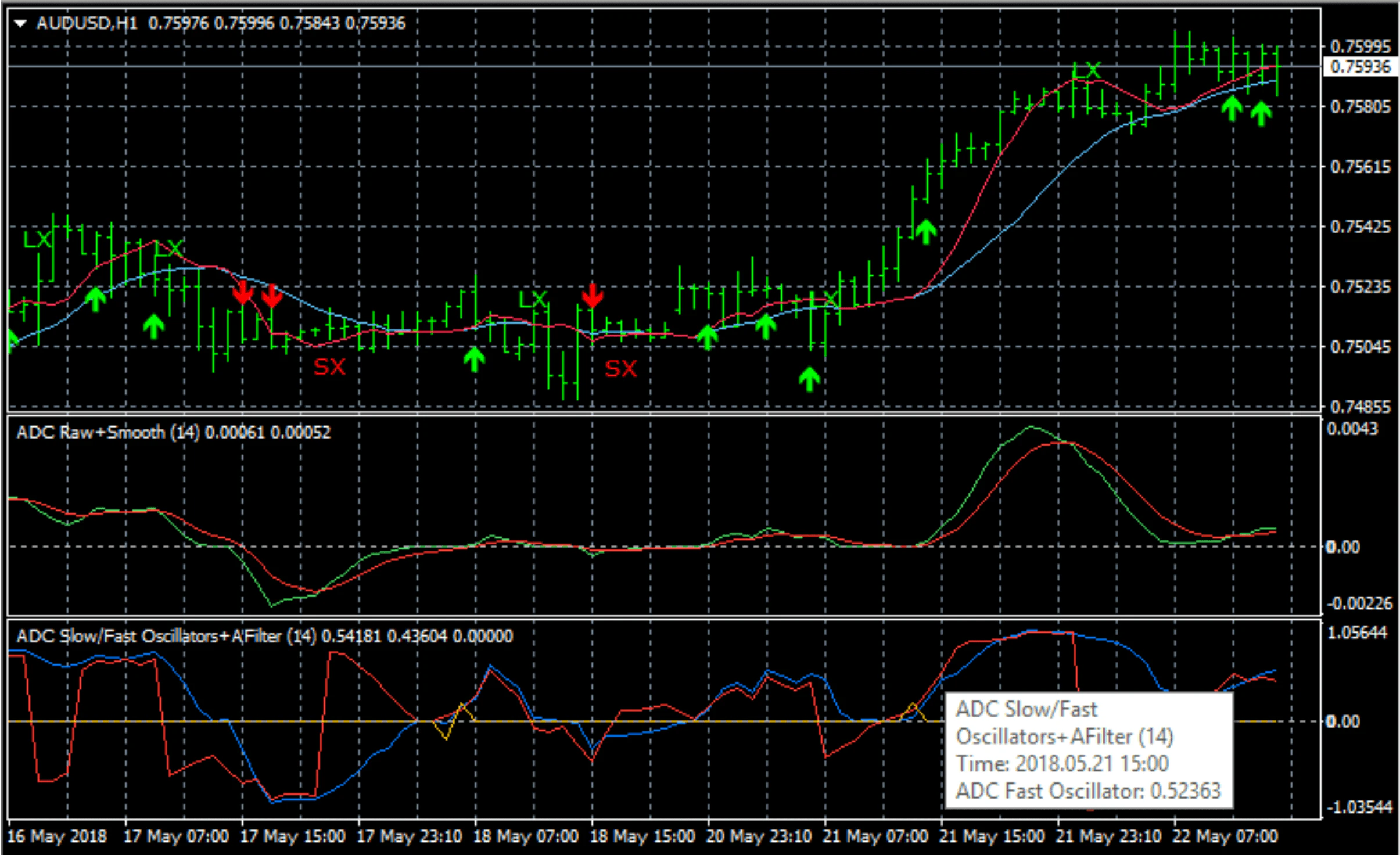 ADC has two compatible oscillators. For fast signals, look for the fast oscillator to be sloping up and above zero. For slow signals, look for the fast oscillator to be above the slow; or look for the slow oscillator to be sloping up, below the fast oscillator, and above the adaptive filter.