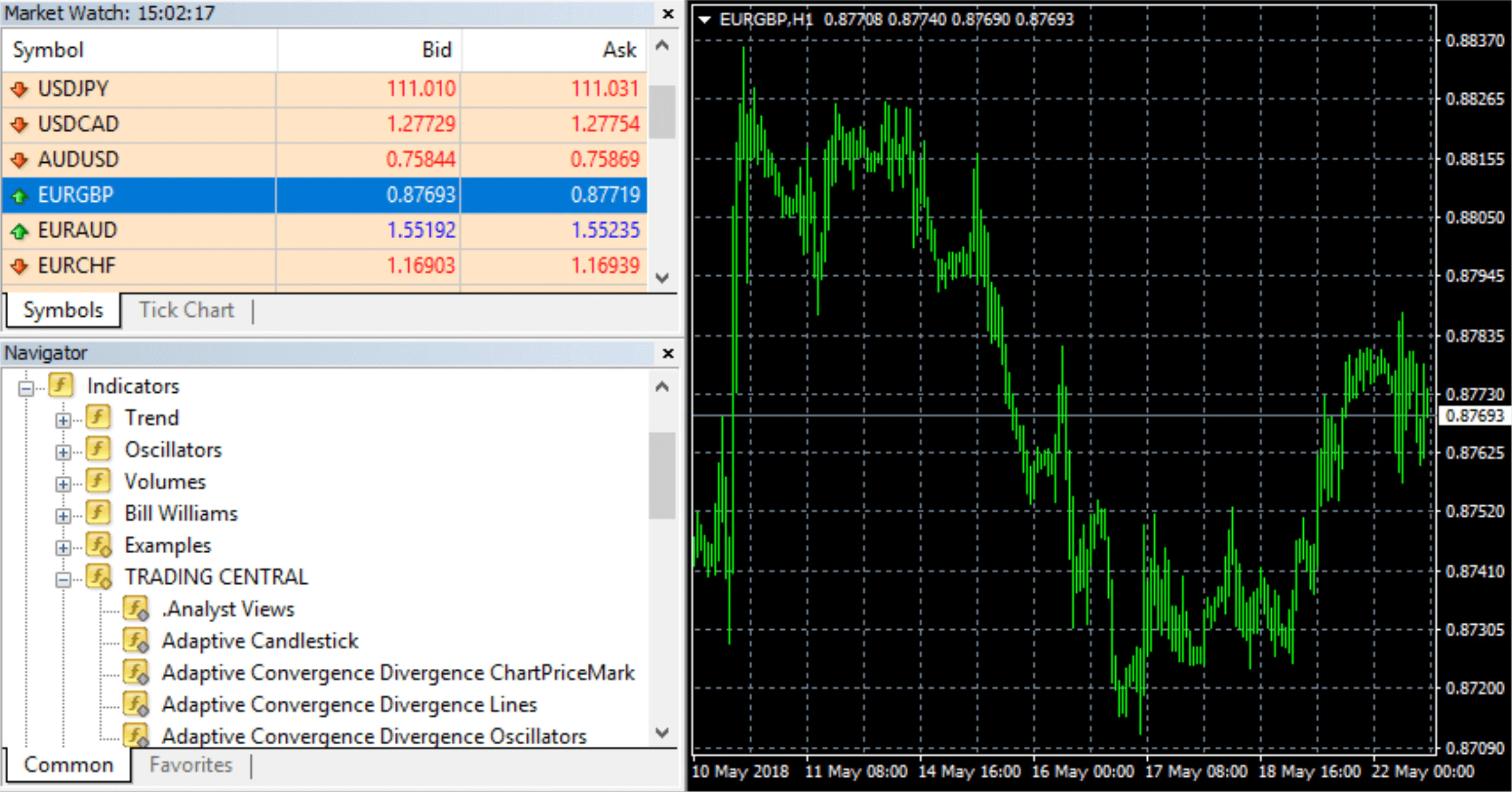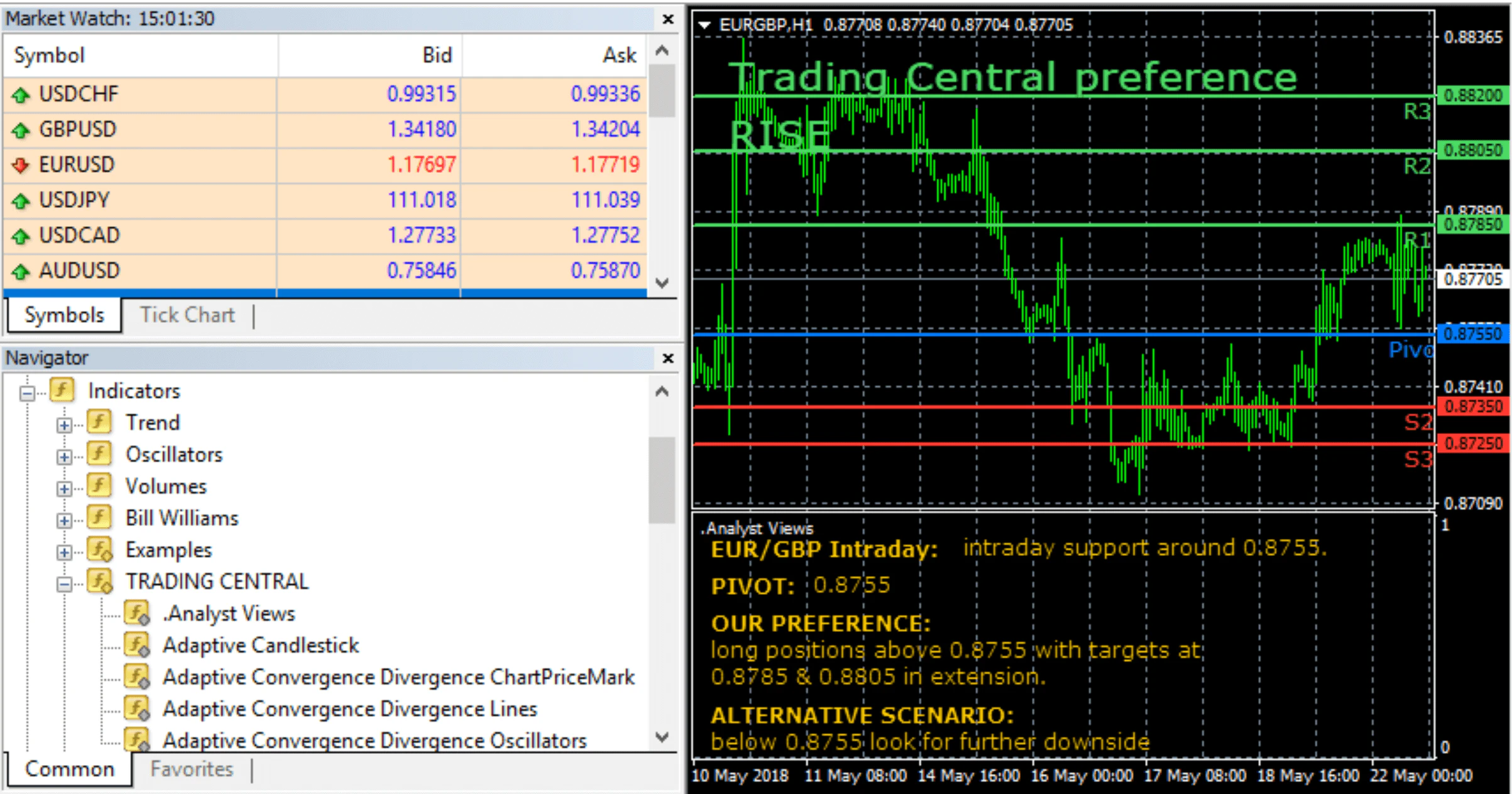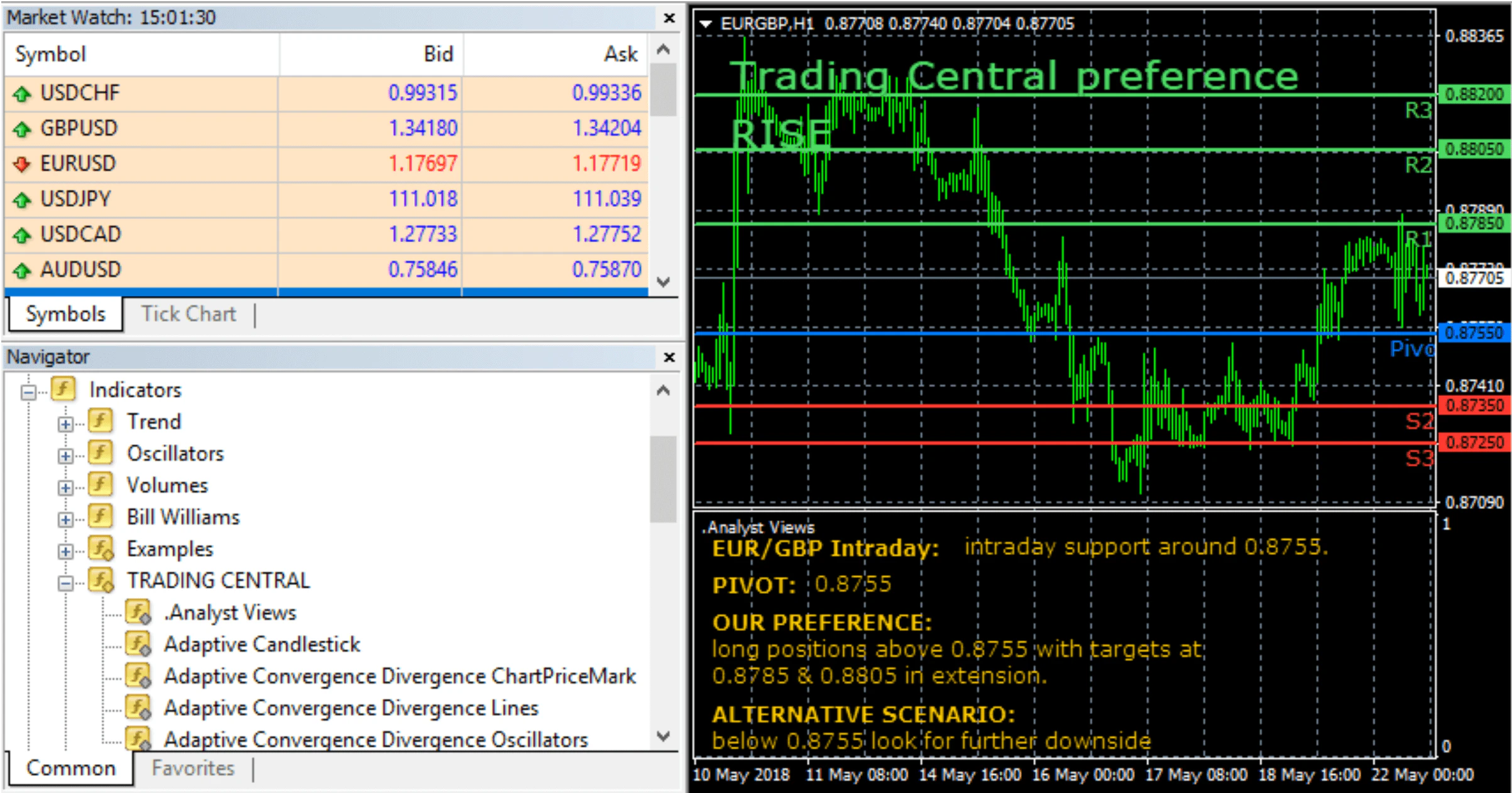 Locate Trading Central indicators along with the others in your MetaTrader indicator list.