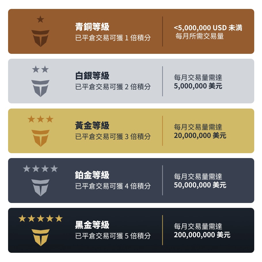 交易越多,等級越高,獲得的積分也越多。每月的交易量將決定您的等級。達成當月目標即可晉升或維持目前等級;若未達成目標,等級可能在下個月下降。只要提升交易量,您就能再次升級。