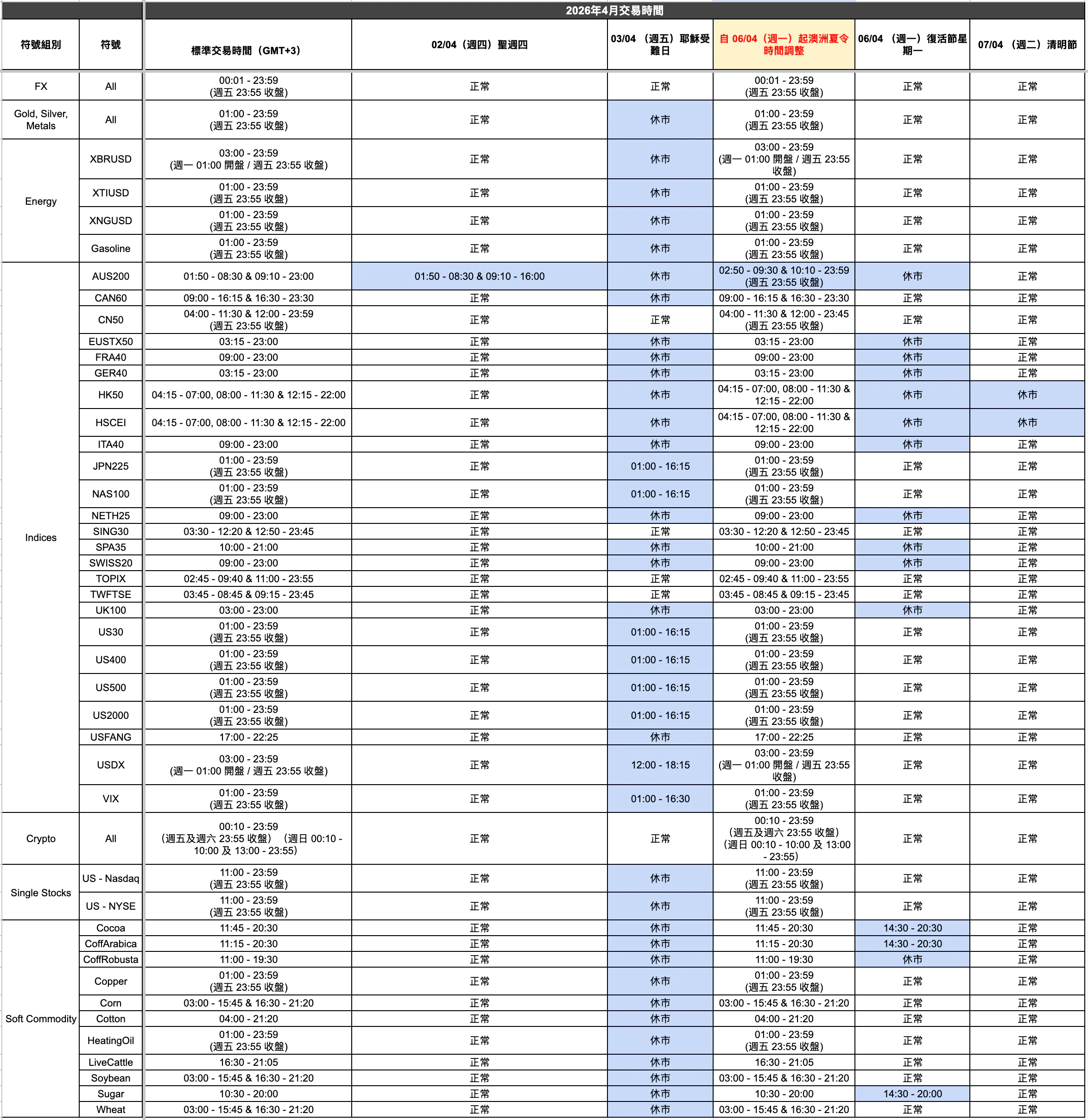 Titan FX Team 30th March 2026 由於澳洲夏令時(DST)調整,部分產品的交易時間將會有所變動。同時,受澳洲夏令時調整影響,並疊加復活節及清明節等公共假期,部分產品的交易時間也將因此改變。請參閱下表了解所有變動的完整詳情,並據此安排您的交易。請點擊圖片以放大查看。除上述所提及的情況外,市場將照常開放。