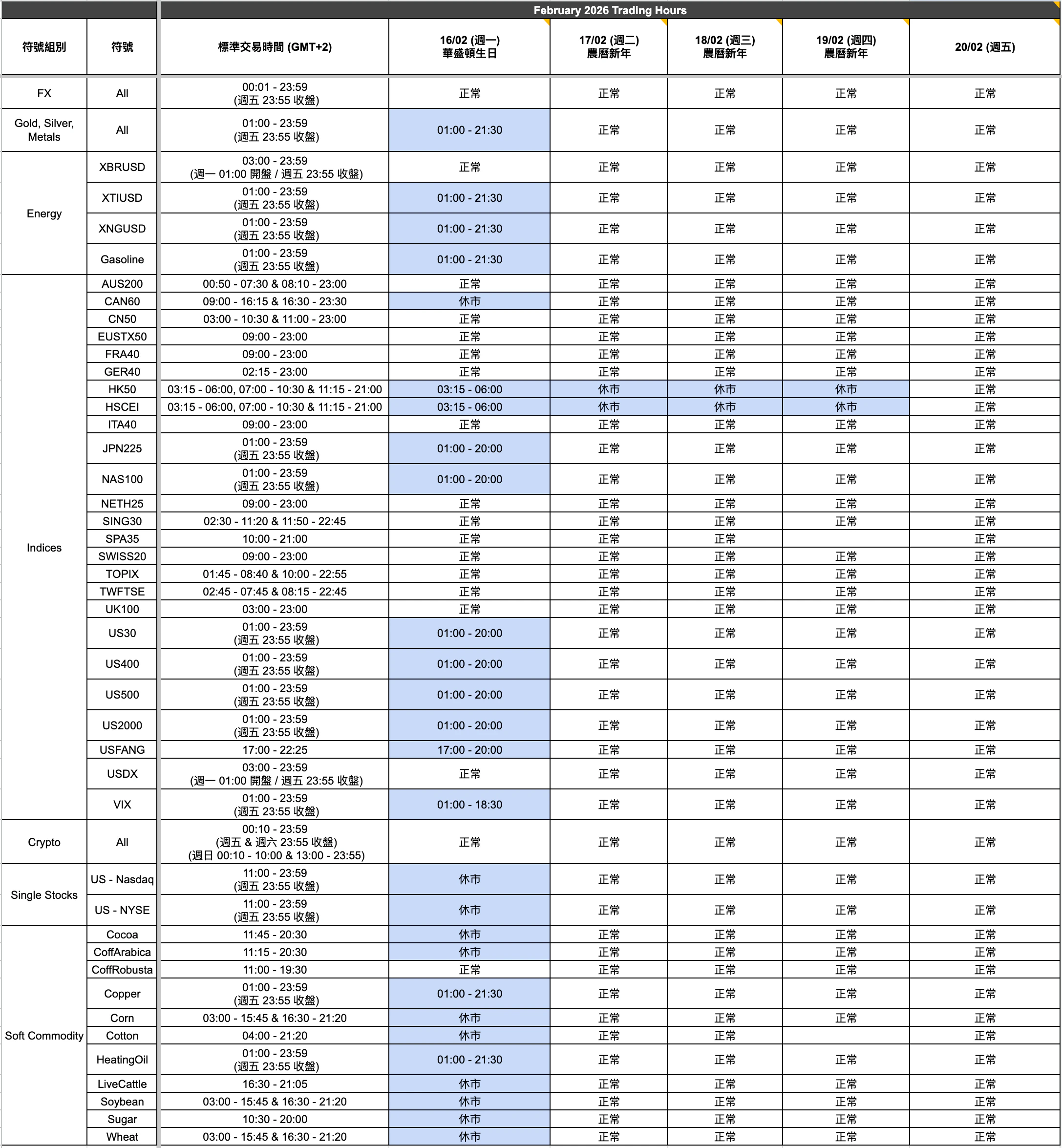 Titan FX Team 13th February 2026 由於二月份的公眾假期,部分商品的交易時間將有所調整。請參閱下表了解所有變動的完整詳情,並據此安排您的交易。請點擊圖片以放大查看。除上述所提及的情況外,市場將照常開放。