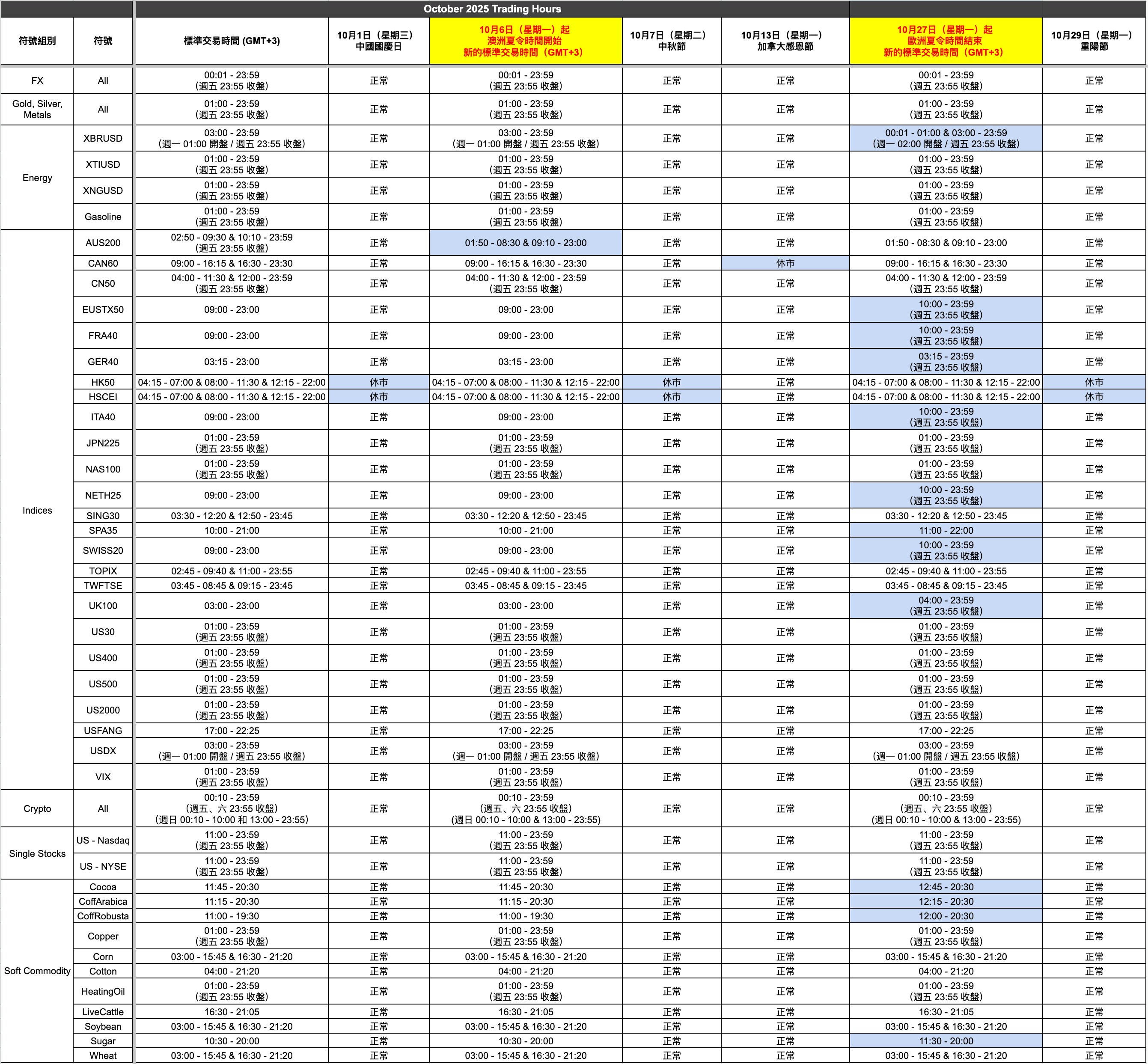 Titan FX Team 29th September 2025 由於10月公共假期,部分商品的交易時間也將隨之改變。請參閱下表以了解所有這些變更的完整詳情,並據此規劃您的交易。請點擊圖片以放大查看。除上述所提及的情況外,市場將照常開放。
