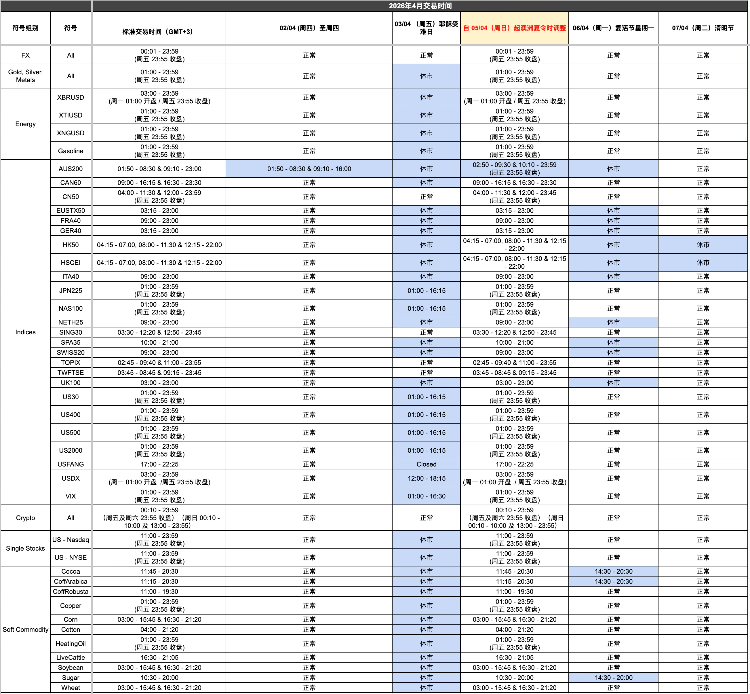 Titan FX Team 30th March 2026 由于澳大利亚夏令时(DST)调整,部分产品的交易时间将有所变动。同时,受澳洲夏令时调整影响,并叠加复活节及清明节等公共假期,部分产品的交易时间也将因此发生变化。请参阅下方表格以了解所有相关调整的详细信息,并据此合理安排您的交易。请点击图片放大查看。除上方标明的情况外,市场将照常开放。