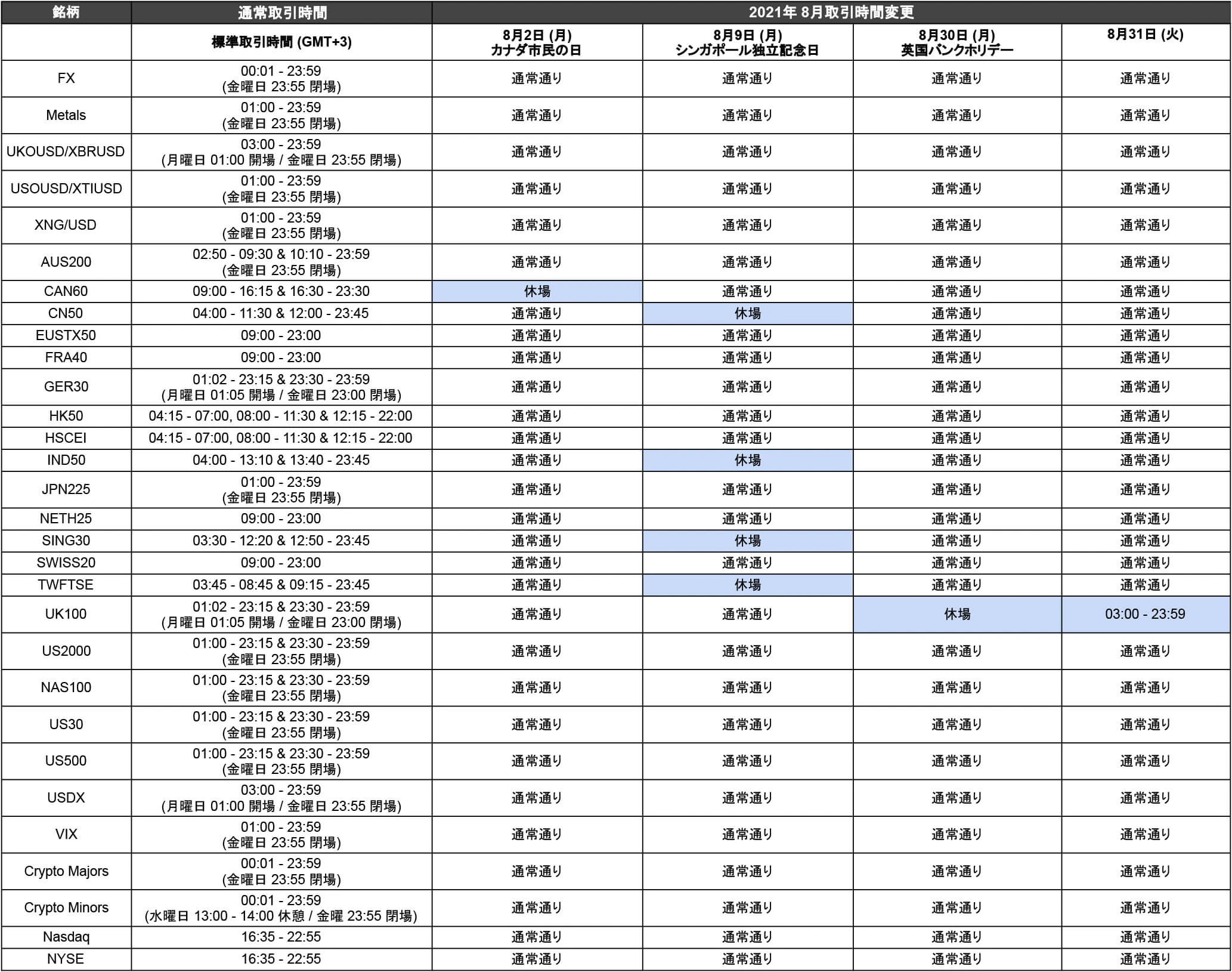 2021年8月各国の祝日に伴い、一部商品の取引時間に変更がございます。