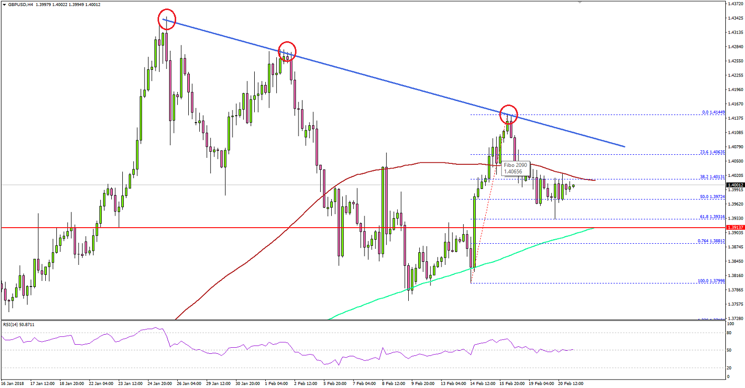 ポンド/米ドルは下落し、下値1.3799 上値1.4144の値動きで形成されたフィボナッチリトレースメント23.6%ラインを下抜けしました。さらに、1.4000のサポートや、100日単純移動平均線(赤、4時間足)を次々に割り込む展開に至っています。しかしながら、その後、同ペアは、下値1.3799 上値1.4144の値動きで形成されたフィボナッチリトレースメント61.8%ライン近辺でサポートされました。上昇局面では、1.4080を現レジスタンスとする重要な下降トレンドラインが形成されています。ポンド/米ドルが現在のレベルから上昇した場合、1.4050、続く1.4080近辺で強い売り圧力に直面することになりそうです。終値で、1.4080に乗せることが出来た場合、続く1.4100のブレイクをきっかけに目先では上昇幅を広げる展開が予想されます。下落局面においては、1.3920-1.3930のサポートエリアが重要なポイントとなりそうです。同ペアが、1.3920を下抜けした場合、更なる下落の展開が予想されます。本日、英国では、2018年1月期の雇用統計等の重要な指標発表が予定されています。英・雇用統計の市場予測は、前回値0.86万人を下回る、0.41万人となっています。一方、1月期の英・失業率は4.3%の維持と予想されています。これらの結果が発表された後、ポンド相場への影響に注目が集まりそうです。失業率が予測を上回った場合、ポンド/米ドルは1.4080に向かって上昇する可能性があります。逆に、予測を下回った場合、1.3920のサポートレベルでの維持に苦戦する展開となることが予想されます。