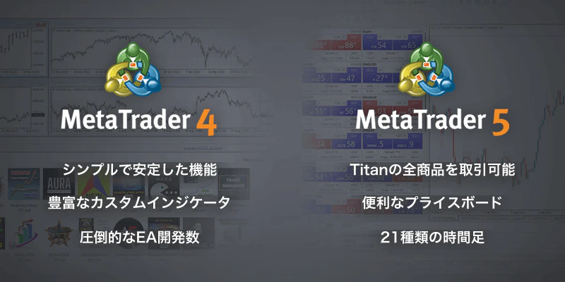 Titan FXでは、MT4とMT5のどちらもお使い頂けます。その他の機能に関しては、こちらも併せてご覧下さい。