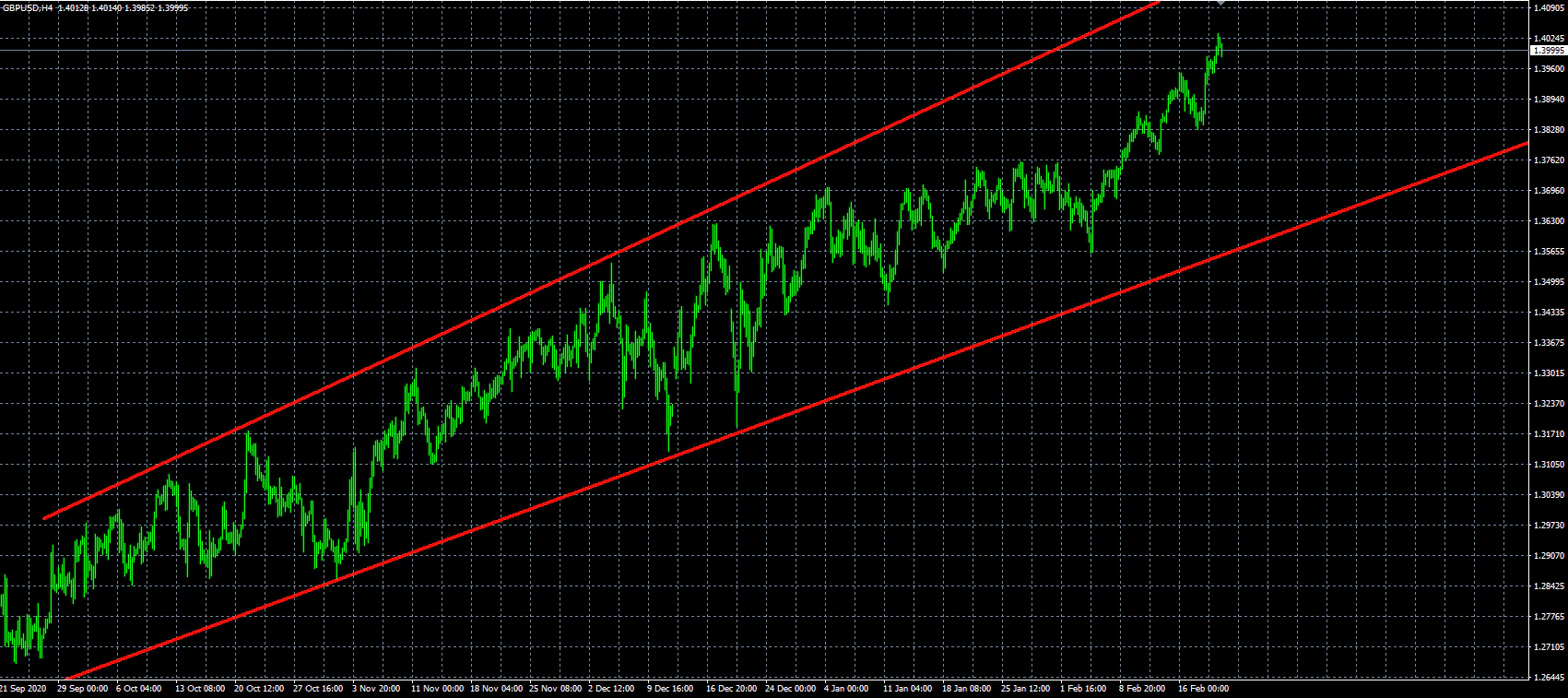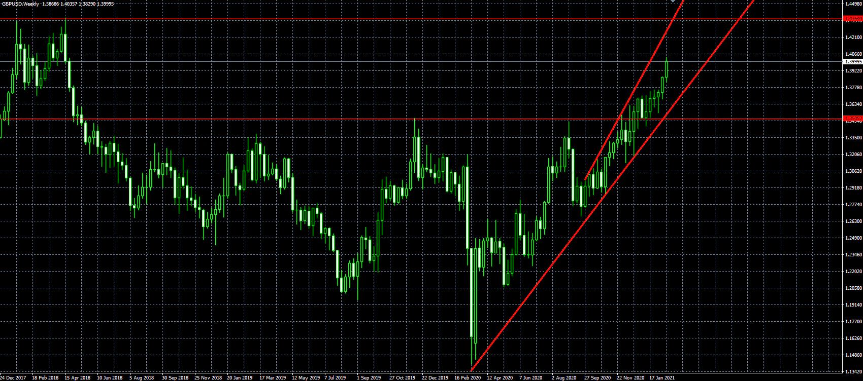 ポンドドルの週足では長い上昇基調が続いている。上昇基調は2020年3月から、実に1年に渡っての上昇であり、昨年8月に起きた下落で2018年4月の高値と2020年3月の高値と安値を結んだ価格の61.8%を意識はすでにされている。このまま上昇が続けば100%戻し、1.43600付近を意識する部分までの上昇はありそうだ。