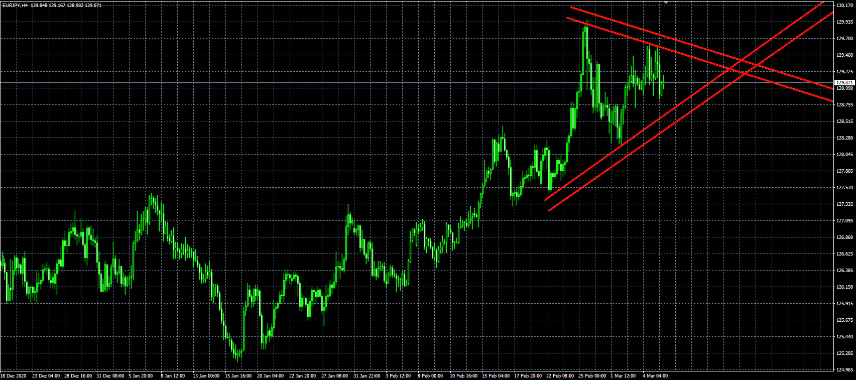 ユーロ円の4時間足は三角持ち合いの形成となっている。良い形で収束すれば、そこからの抜けで力強い展開となりそうだ。上に跳ねる可能性が比較的高い形ではあるが、上下どちらに抜けるのか不透明でもあるので、上下での待ち伏せがよさそうだ。20Pips程度、ラインから外した部分での待ち伏せを。画上で言えば赤いライン外側辺りでの待ち伏せを行いたい。