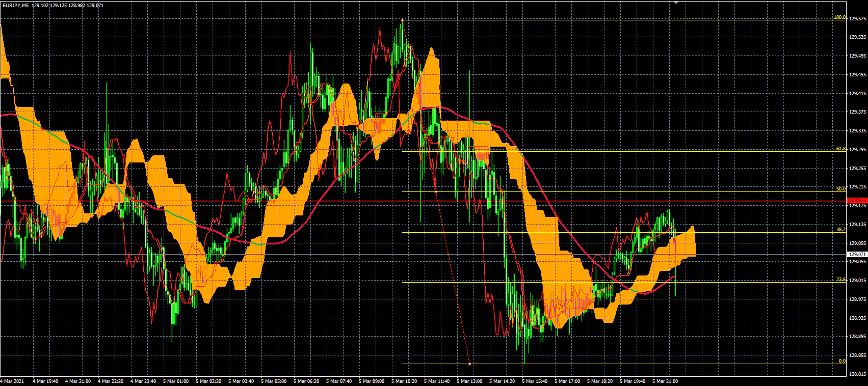 ユーロ円5分足では129.20付近を抜ければ129.25~30までの10Pips程度の買いサインは出ている。129.25-30辺りは直近の高値安値の50%~61.8%であり、ここから上昇した場合は意識をされそうだ。129.25-30付近で一旦、もみ合ったあとに再度の上昇となれば129.50迄の前戻しの可能性もでてきそうだ。