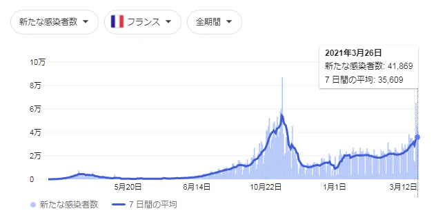 フランスでは24日に1日の感染が65,000人強を記録し、1週間の平均感染者薄が35,000人を超えるなど19日からロックダウン措置を導入、イタリアでも死者数の急増によるロックダウンを各州が導入するなどしている。