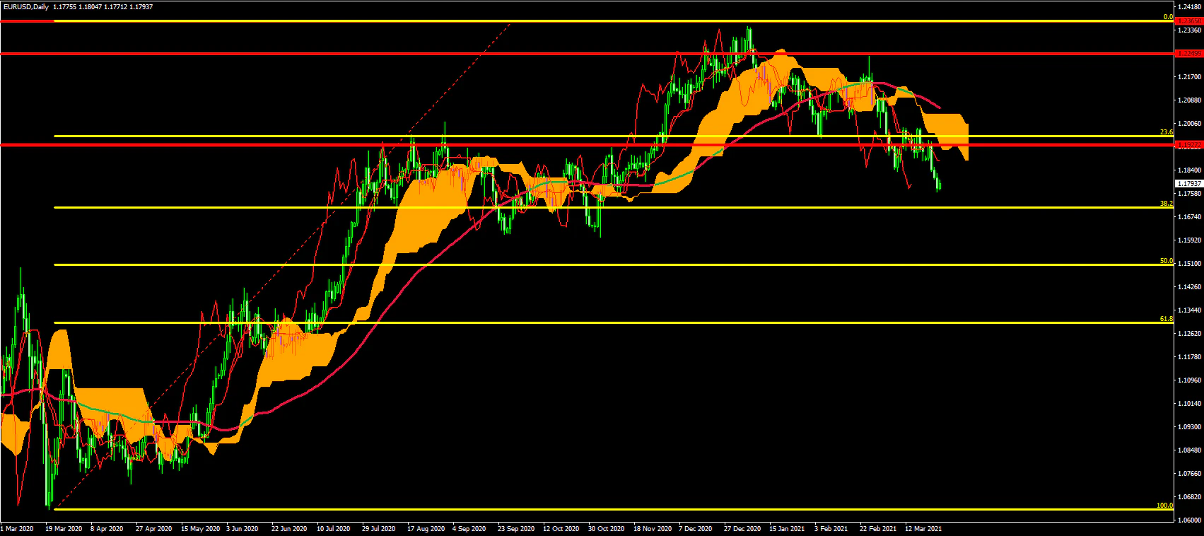 ユーロドルの日足は高値圏で意識されていた1.19200付近を下回ったことで下降トレンドが発生しつつある。このままの下降となれば2020年3月20日の安値1.06370と2021年1月5日の高値1.23054を結んだ値幅の38.2%=1.17000付近、50%=1.15000付近、61.8%=1.12950付近までの下落となる可能性が見て取れる。