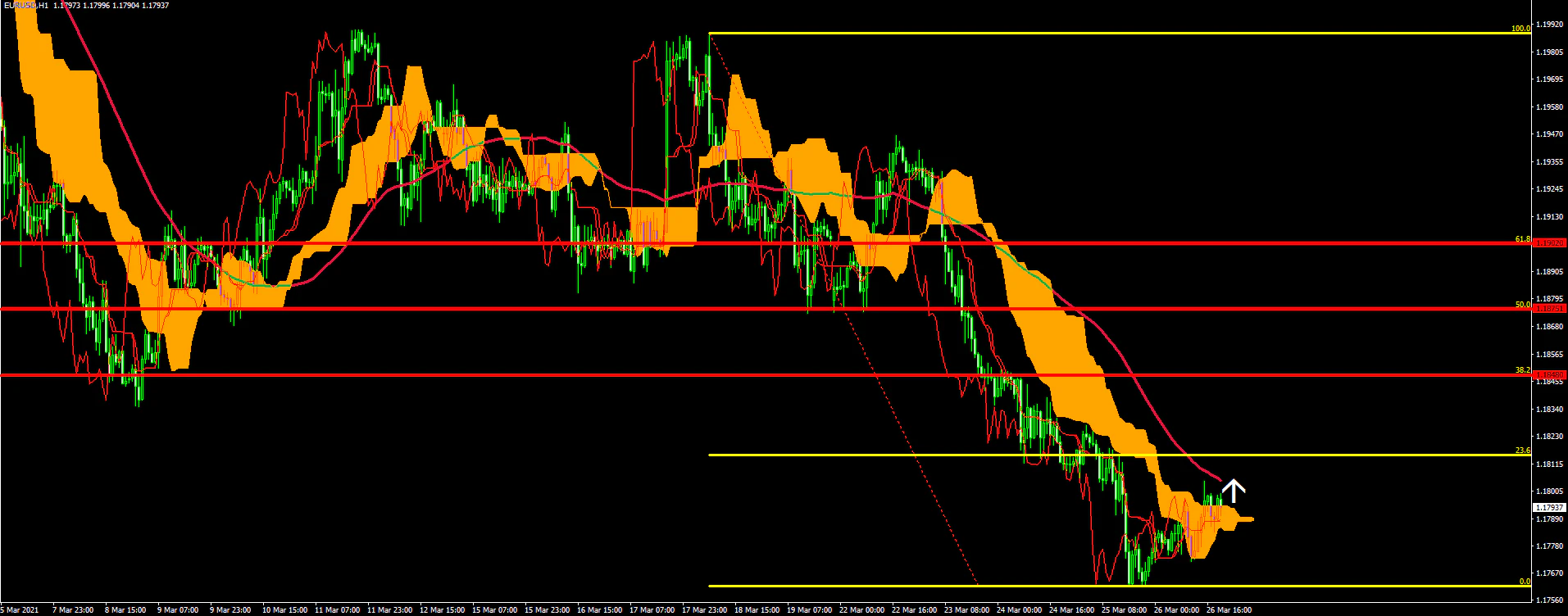 ユーロドルの1時間足は安値圏からの戻りの可能性を見て取れる。図中の白い矢印のように上昇に転じれば、1.18480~1.19020までの戻りの可能性はありそうだ。まずはこのまま移動平均線を抜け、その後、値を下げて平均線に再度の接触をする、グランビルの法則、波動論などでの上昇トレンドの初動の動きを行うことが必要となる。上げてから戻すという山の形成が必要となるが、形が形成されると、サインとしての精度は非常に高くなるだろう。