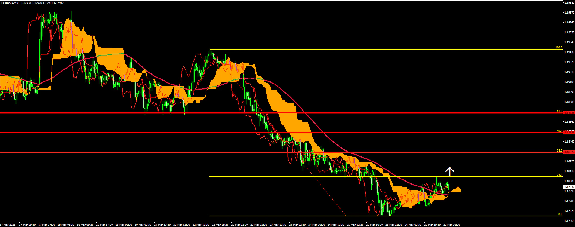 ユーロドル30分足では1時間足で説明した上昇トレンド形成に必要な山の形成を既に行っており、ここからの上昇に期待を持ちたいところだ。形成された山の高値が1.18047であるので、1.18100付近を上抜ければ、38.2%=1.18320付近、50%=1.18540付近、61.8%=1.18760付近までの上昇を見込める上昇トレンドが発生するかもしれない。