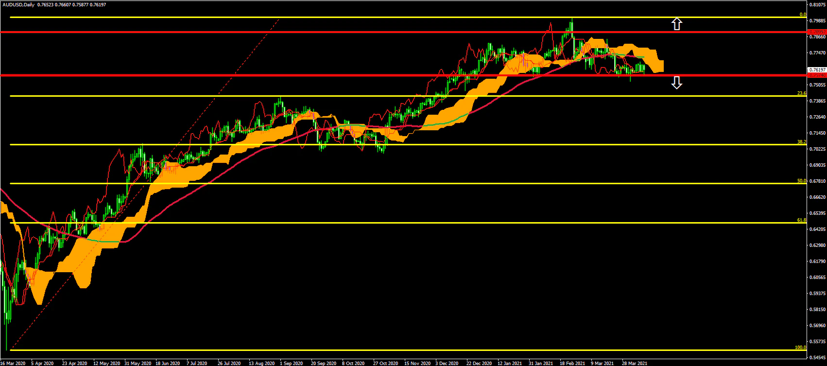 AUDUSDの日足は上下でのサインが点灯している。0.75740付近を抜ければ下降に、0.78900付近を抜ければ上昇に転換する可能性がある。下降すれば2020年3月19日の安値と2021年2月25日の高値との値幅の38.2%戻りの0.70500付近、50%戻りの0.67600付近まで値を下げてくる可能性があり、61.8%戻りとなる0.64500付近も視野に入りそうだ。