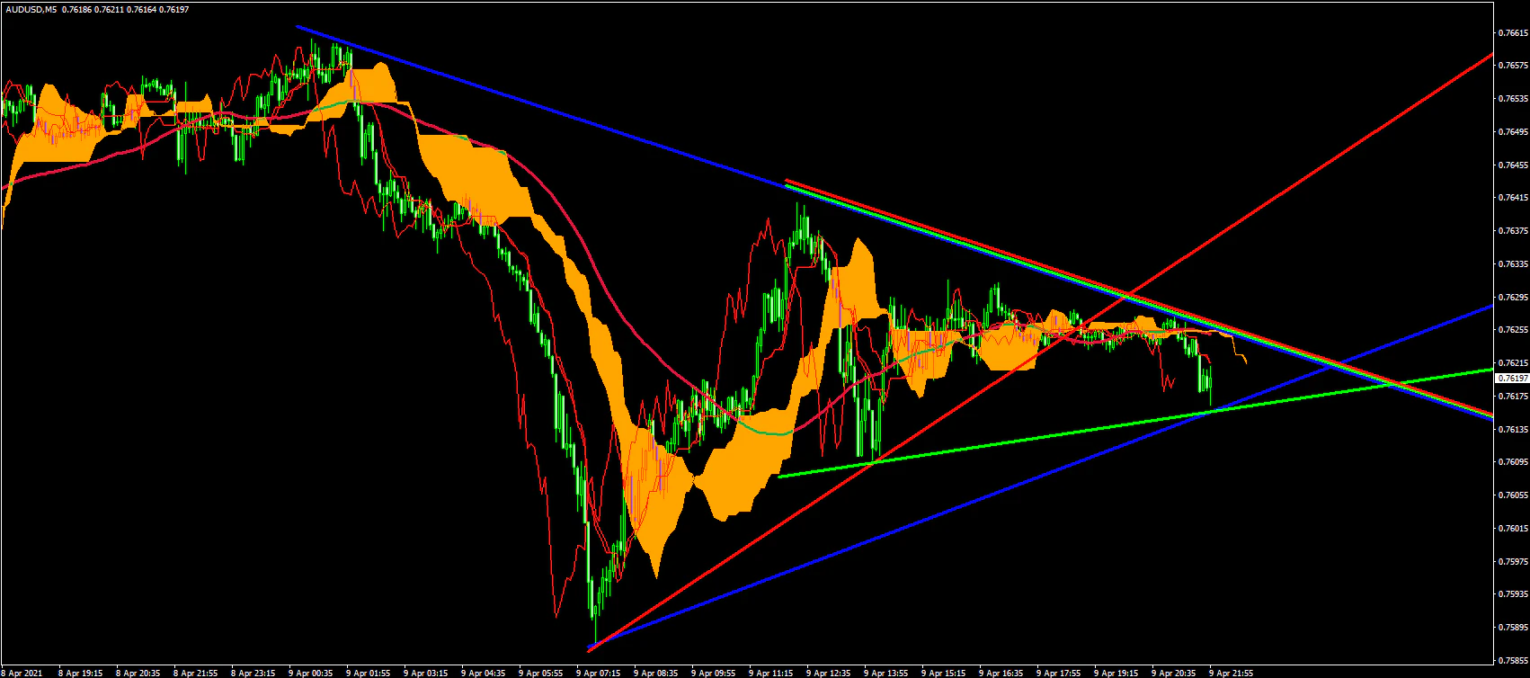AUDUSDの5分足は様々な抵抗線、支持線が交差しており、少し方向性の見えにくい展開となっている。どの形も三角持ち合いの形状ではあり、上値抵抗線、下値支持線の線を引く事が出来るが、はっきりとした方向性としてはわかりにくい部分もあり、5分足での売買には十分な注意を払いたいところだ。
