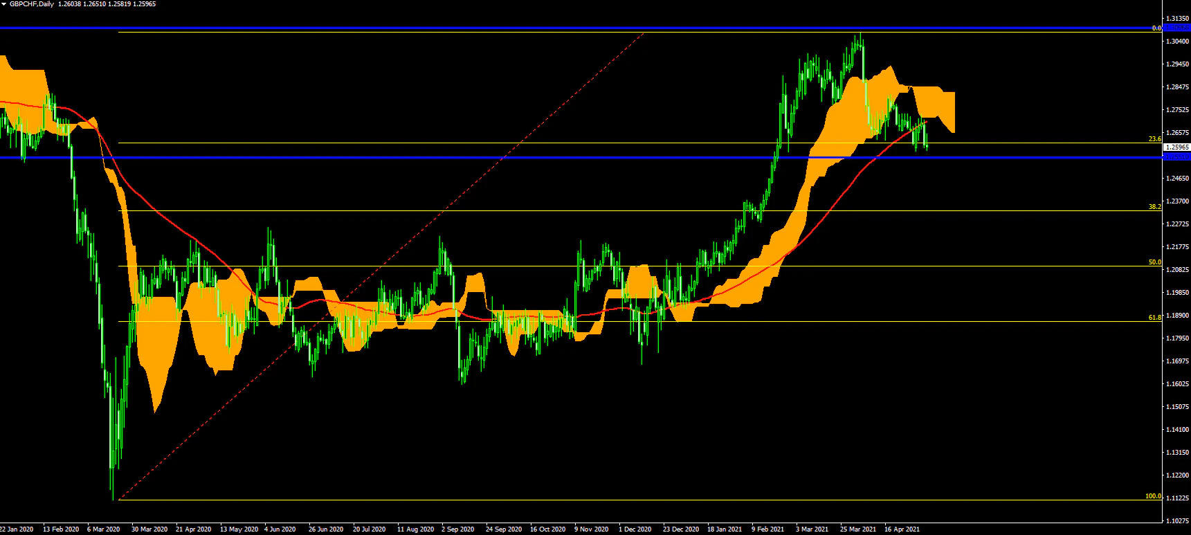 GBPCHFの日足は上値を抑えられる展開となった後の調整に入っている。2020年3月29日の安値1.11135と2021年4月5日の高値1.30737を100%とした場合ここからの下落となれば、38.2%の1.23300、50%の1.20950、61.8%の1.18600を目指す展開となりそうだ。上昇した場合には1.30737を上回れば上昇トレンド継続となりそうだ。