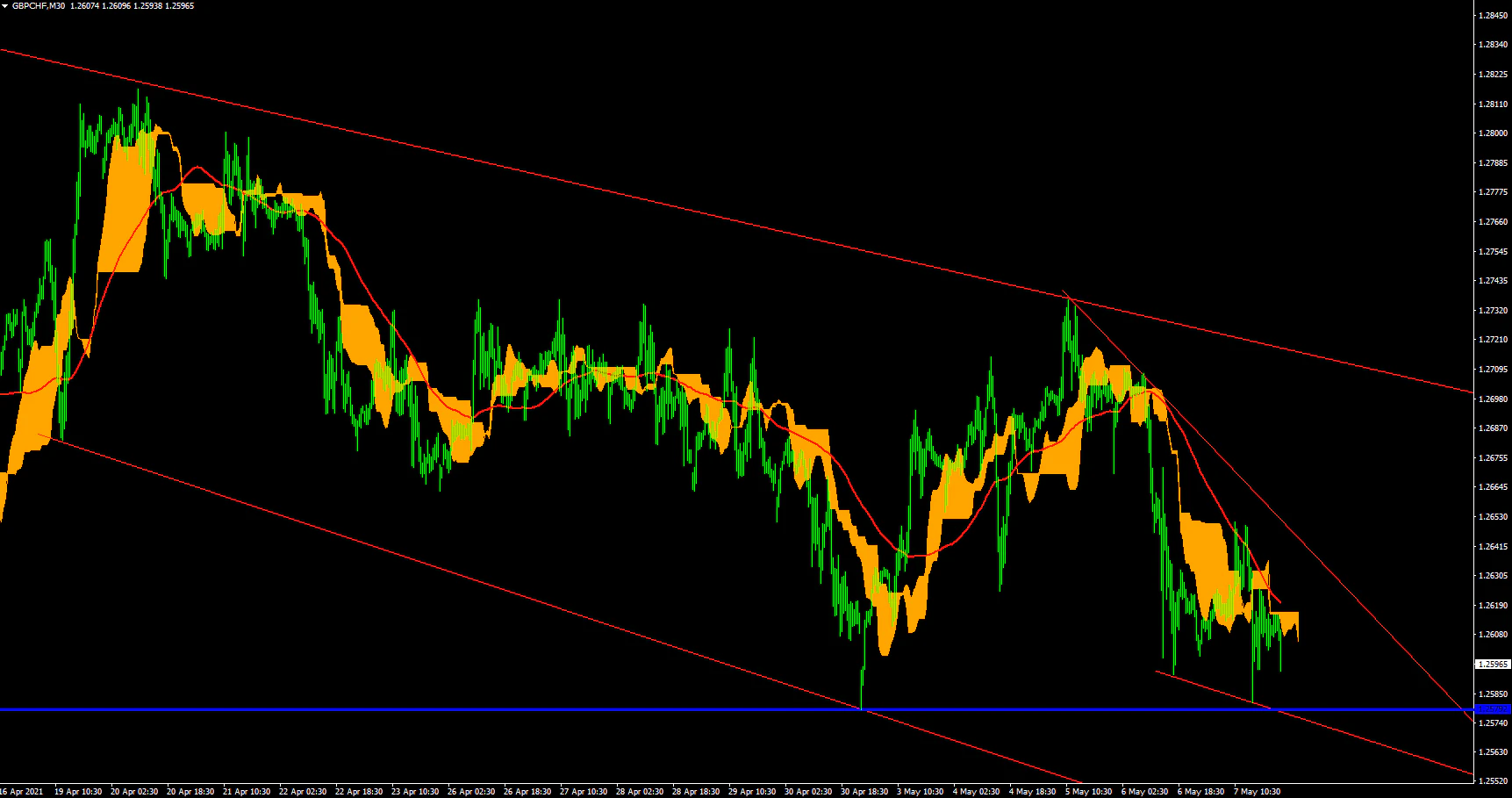 GBPCHF30分足上では緩やかな下降となっている。大きく上下を繰り返しながら、ダウ理論上の切り下げを行い続けており、ここからは下落の可能性がつよくなっている。下降トレンドが継続していた場合には青線で示した5月3日の安値1.25791を下回る必要があり、下抜けるようであれば大きな流れが継続、意識されるようであればトレンドの展開となる可能性がある。日足や4時間足が下降となる可能性が強いことから5月3日の安値を下抜けてくる可能性は強そうだ。