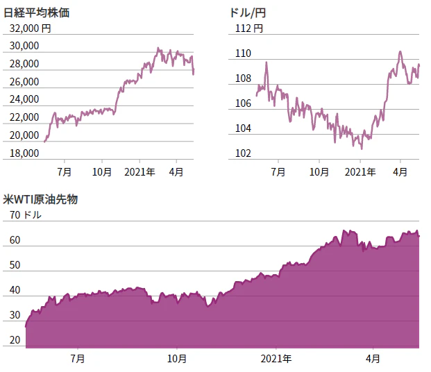 日経平均株価とドル円・原油価格の推移