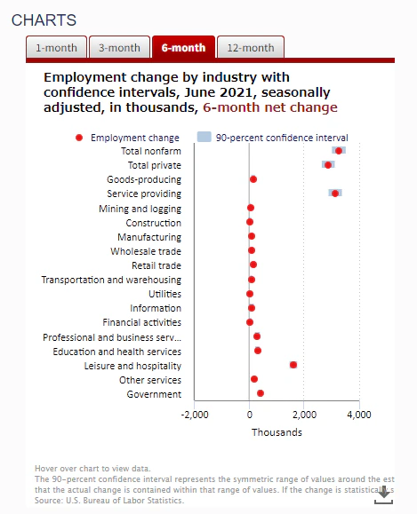 米国産業別雇用変化 2021年6月 季節調整、6か月間の変化