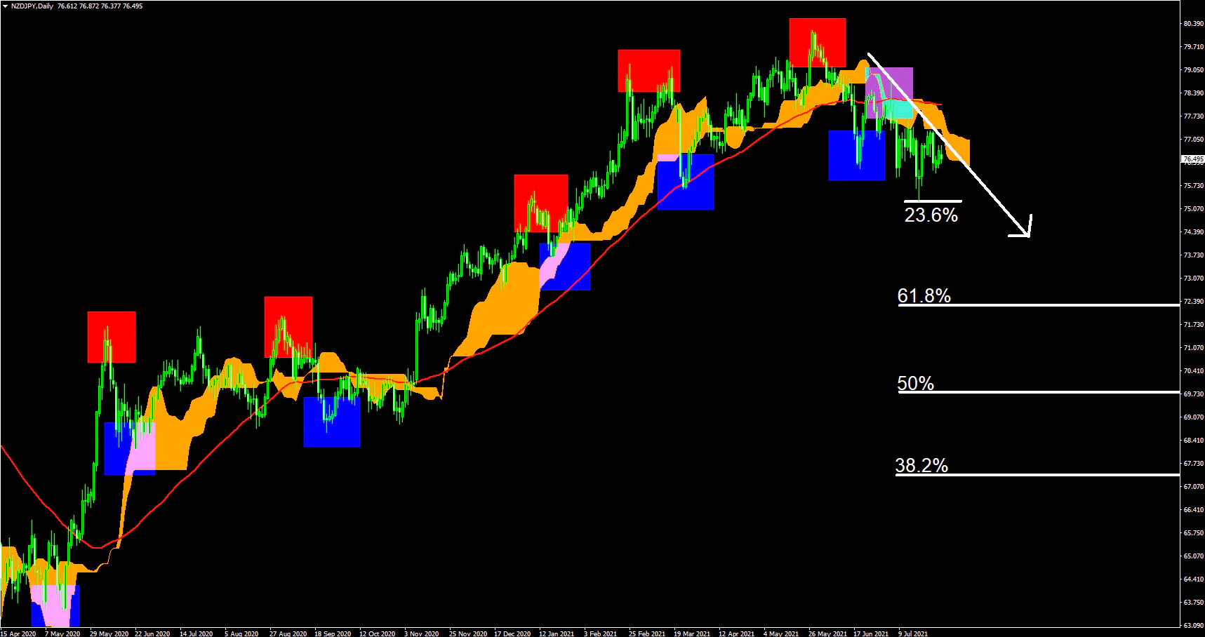 NZDJPYの日足では上昇トレンドからの転換期なっている。高値の切り上げが切り下げに変化した事でレンジ若しくは下降トレンドへと転換しつつあり、23.6%で意識れた後に下降となれば38.2%~61.8%までの下降へと繋がる可能性が見て取れる。紫の部分はb波、23.6%はc波となる可能性があり、下降となればc波の形成後に訪れるであろう、1波~の発生で、一旦はレンジ相場となる可能性もある。揉み合いに近い流れ、上値下値の重い展開となる可能性が強いが、下降へと転じることが出来れば23.6%から61.8%間で意識がなされそう。レンジになるか、下降になるのか、注視していきたい所だ。