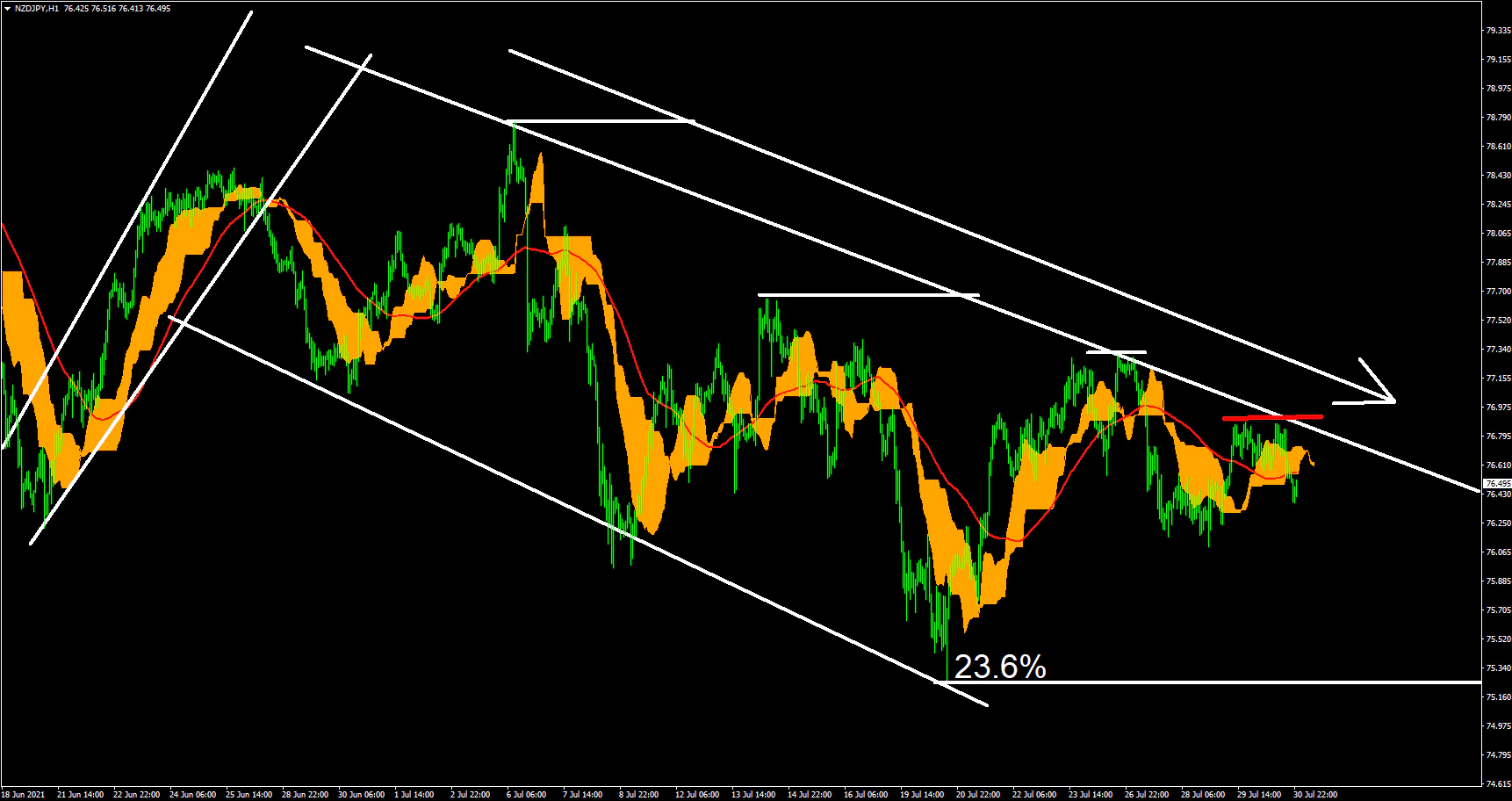NZDJPYの1時間足は緩やかな下降トレンドが継続している。大きく上下に動きながら値を下げる展開が続いており、日足では23.6%が意識された部分が直近の安値となっており、日足での意識の変化が1時間足では大きな変化なる可能性がある。トレンドの変化が明確に起こるには高値安値の切り下げが行われなかった場合である事から、赤線を上抜ければトレンドの転換がありそうだ。