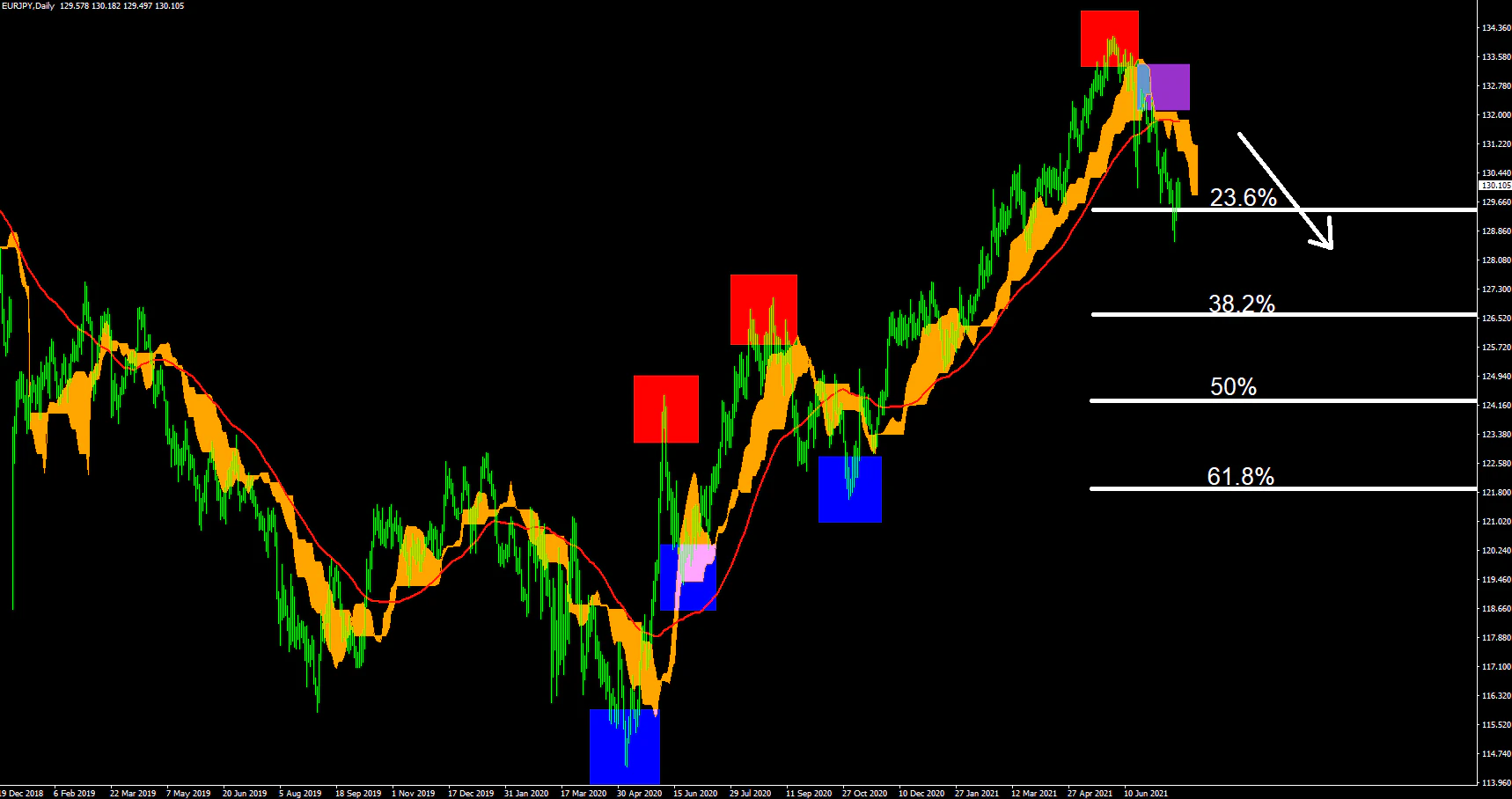 EURJPYの日足では上昇トレンドからの転換期なっている。原則このような形となっている通貨を紹介するので、前回と同じ形だが、転換部分での意識とここからの下降の有無といったところとなっている。
