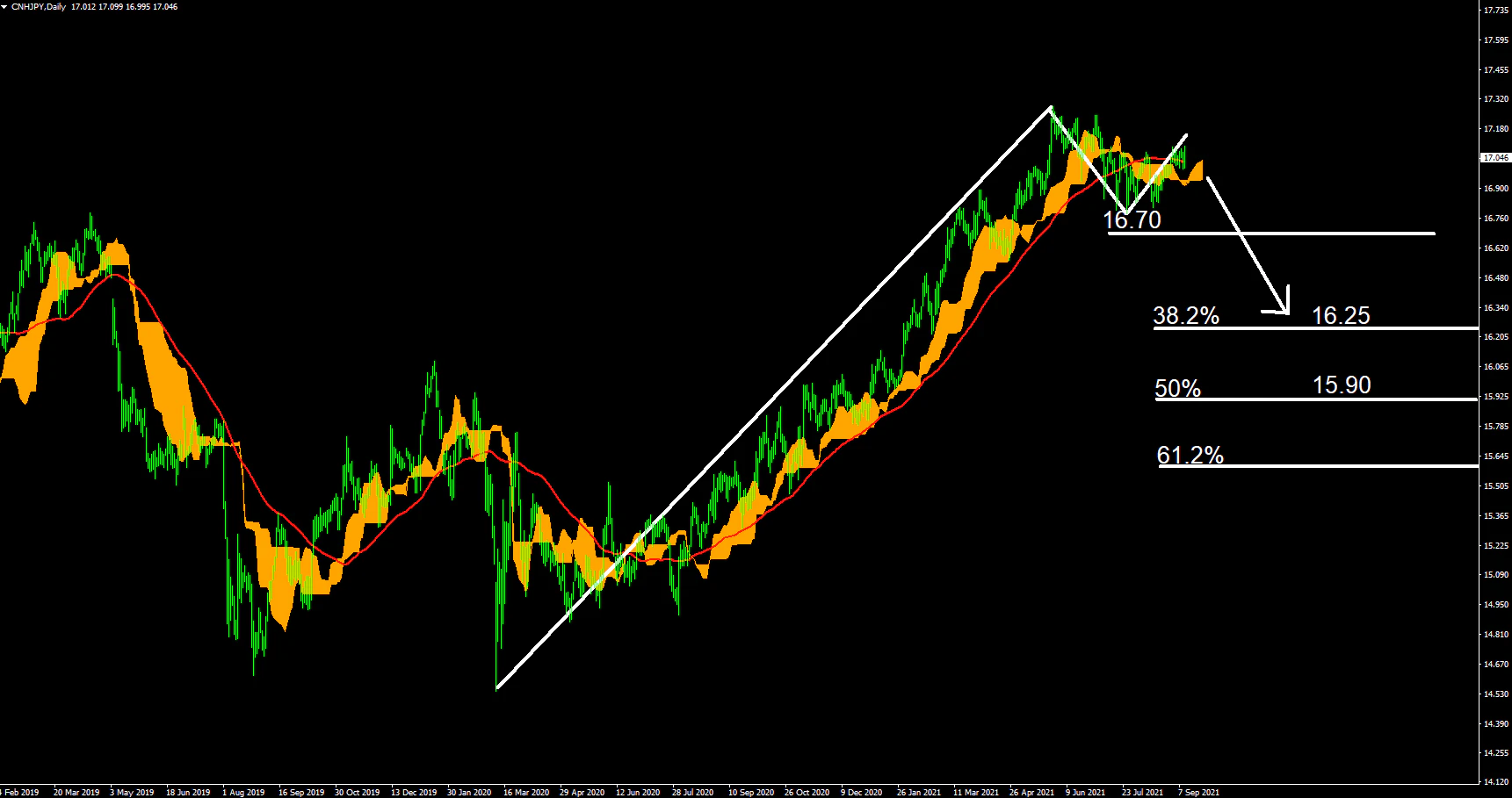 CHNJPYと少しマニアックな組み合わせであるが、日足で売りのサインが点灯している。
