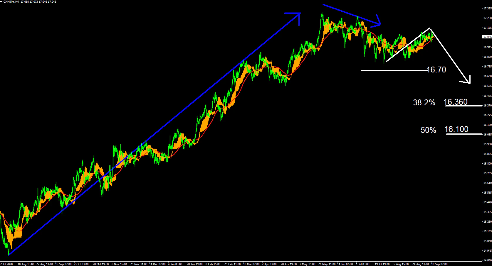 CHNJPYの4時間足でも日足と同様にトレンドが転換しつつある。