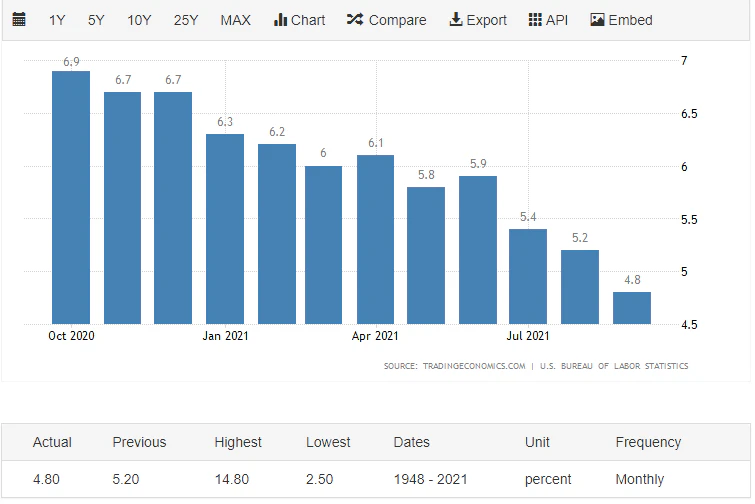 一方で失業率は4.8%と、8月の5.2%から改善し、1年半ぶりの水準となる事で市場の反応もまちまちとなった事で市場は小幅に値を下げる展開となっている。