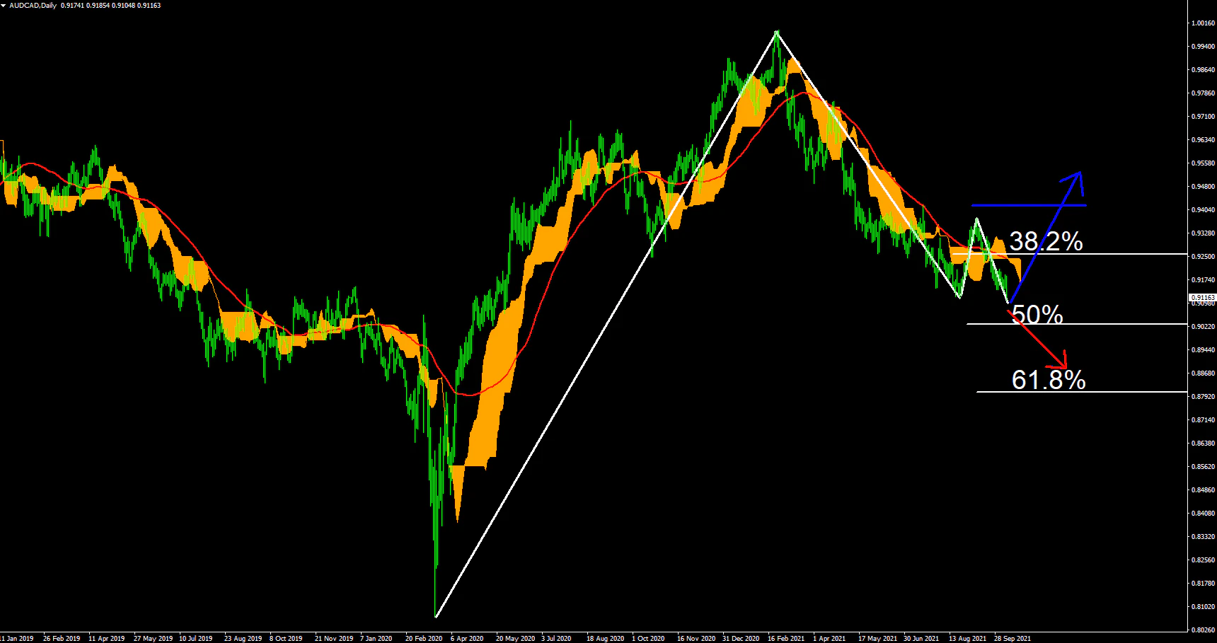 売り目線の場合には図中の赤い矢印の流れとなり、0.87900付近までの下降
